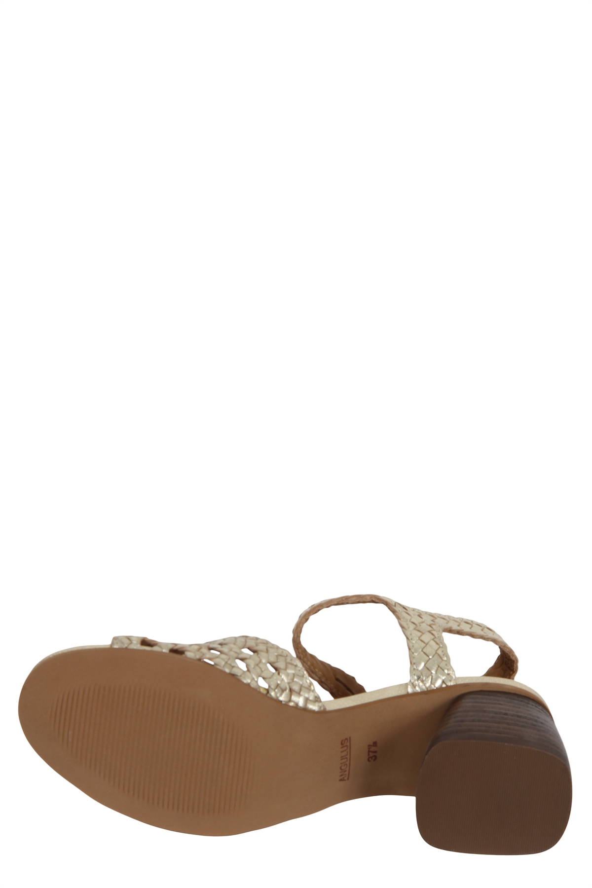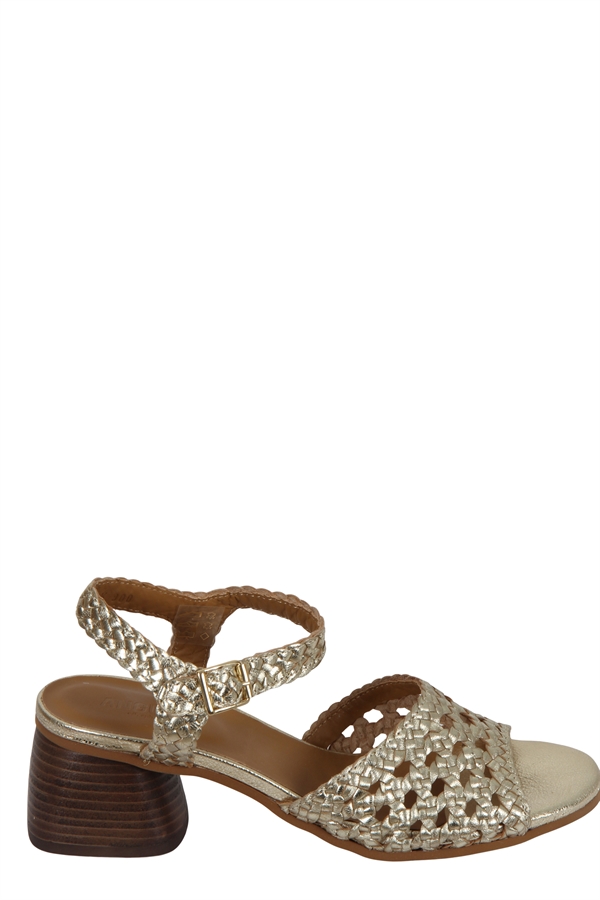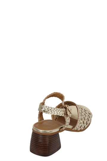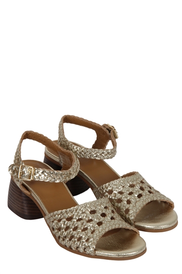 Sandal med 5 cm sål og T-rem fra Angulus. Sandalen har flet ved forfoden og lukkes med spænde om anklen. Smuk gylden farve.