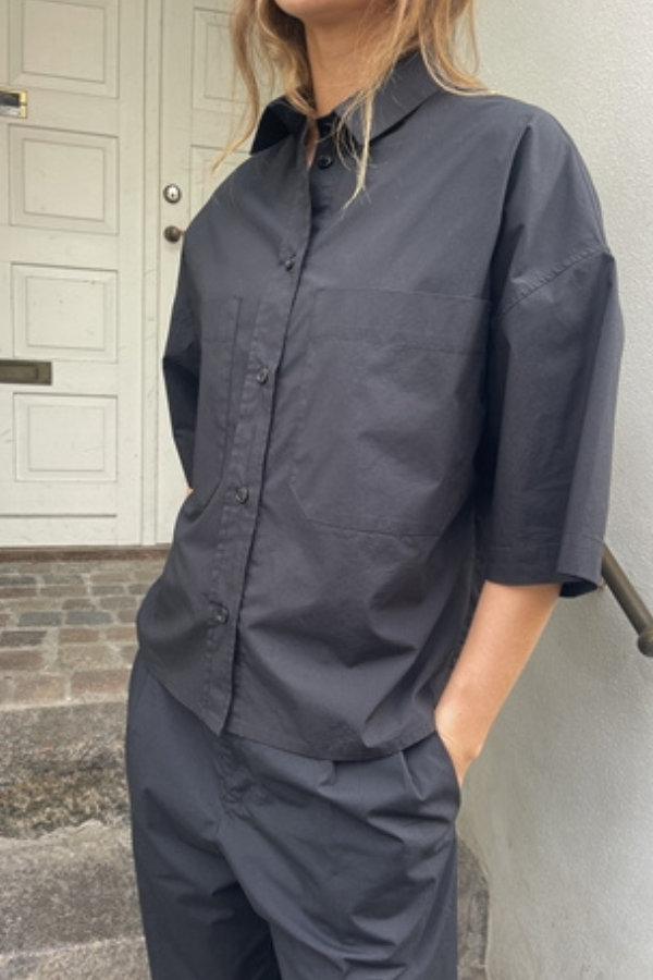 Oversized skjortebluse fra Barena Venezia. Skjorten har krave og lukkes med knapper fortil. Materialet er en let bomuldsblanding, lavet eksklusivt til Barena Venezia, der giver en blød, åndbar fornemmelse og en frisk og raffineret attitude.