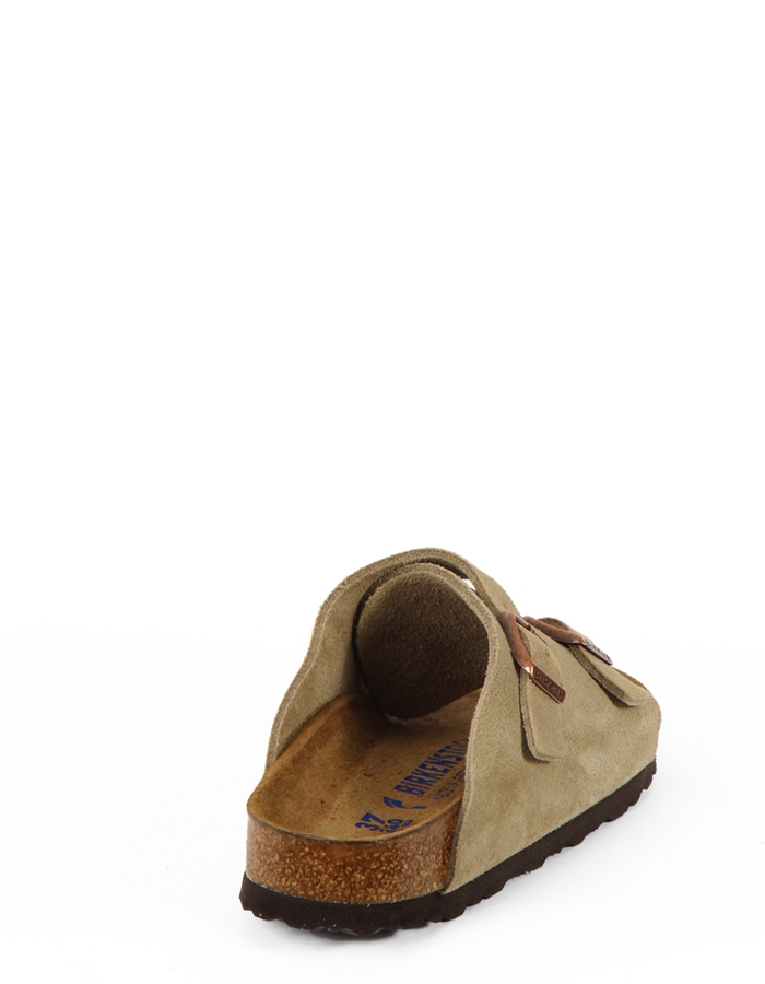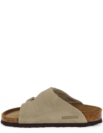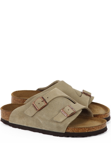 Zürich sandal fra Birkenstock. Zürich er en sandal der har bredt læderstykke over vristen og lukkes med to spænder. Sandalerne har den velkendte kork/latex fodseng med en dæksål i ruskind.