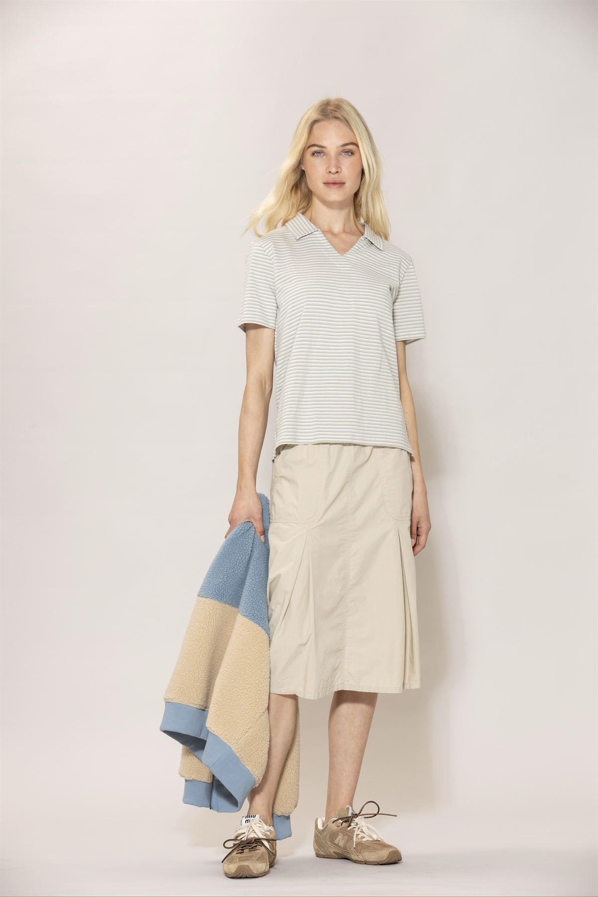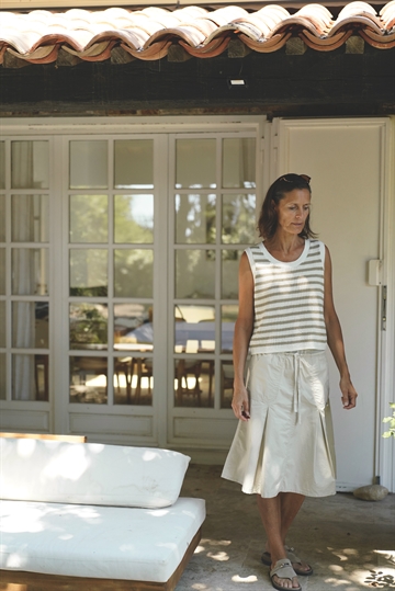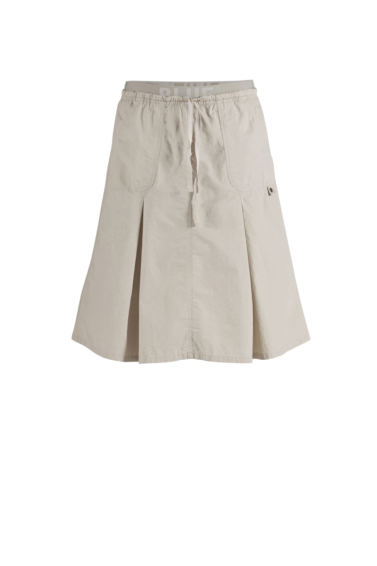 Knælang nederdel fra Blue Sportswear SS 26. Nederdelen har A-shape og flotte fald i stoffet. Nederdelen har elastik ved taljen – sporty, men stadig feminin og nem at style.