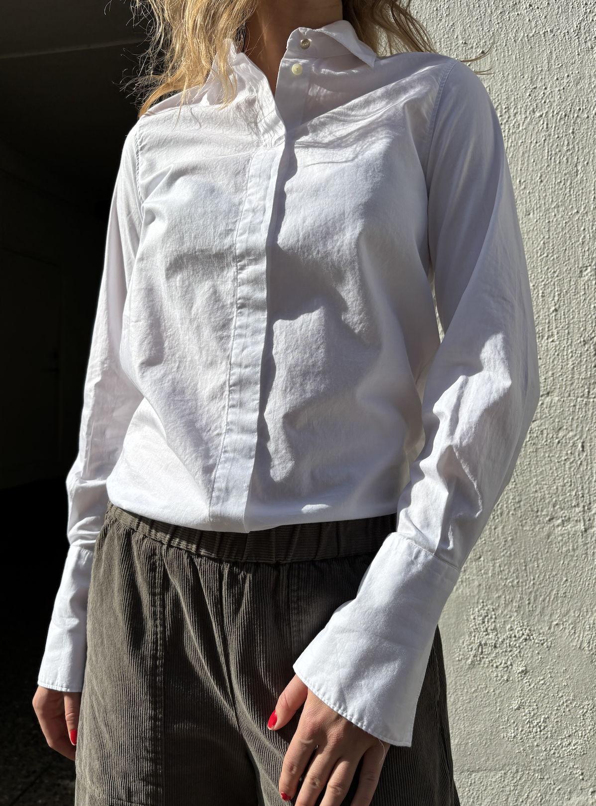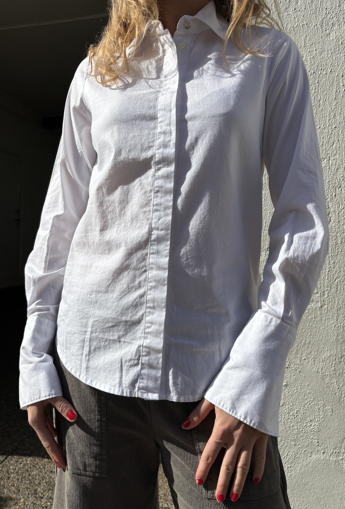 Smuk skjorte fra franske Diega AW 2025. Skjorten lukkes med skjulte knapper fortil, har lille krave og afrunding for neden.