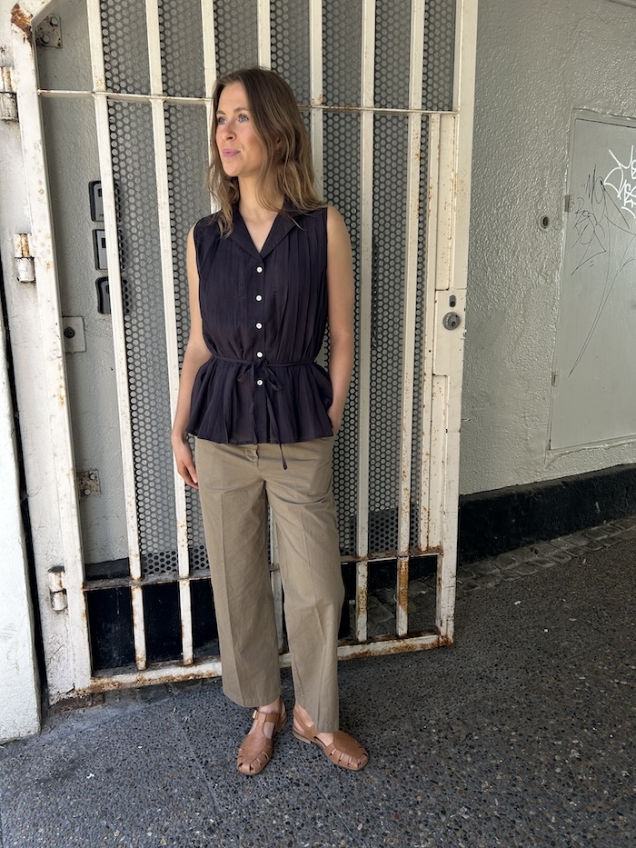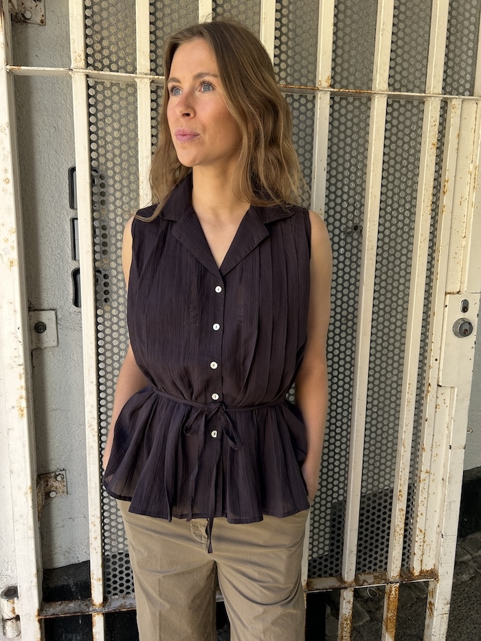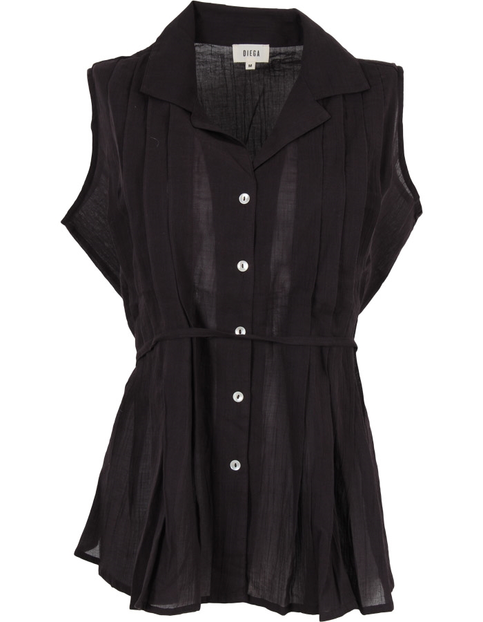 Ærmeløs skjorte fra franske Diega. Skjorten har knaplukning, krave og bindebånd i livet.