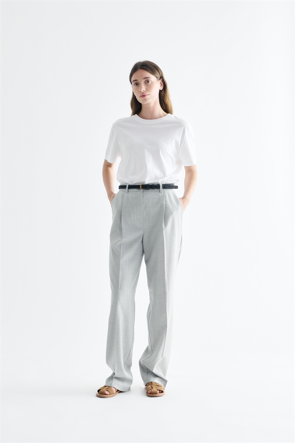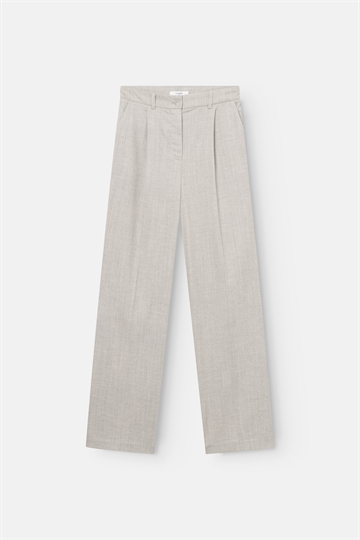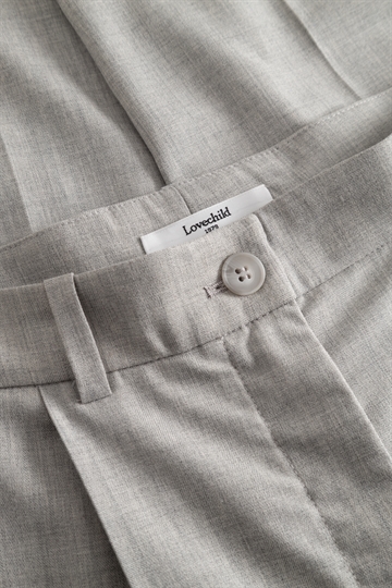 Stilfulde bukser i elegant Light Grey Melange fra Lovechild 1979. Bukserne har klassiske lige ben, syet læg i taljen, skrå forlommer og paspoleret baglomme.
