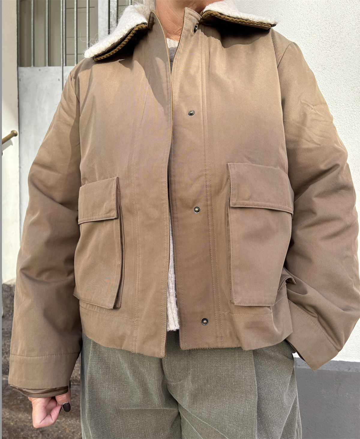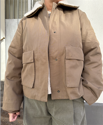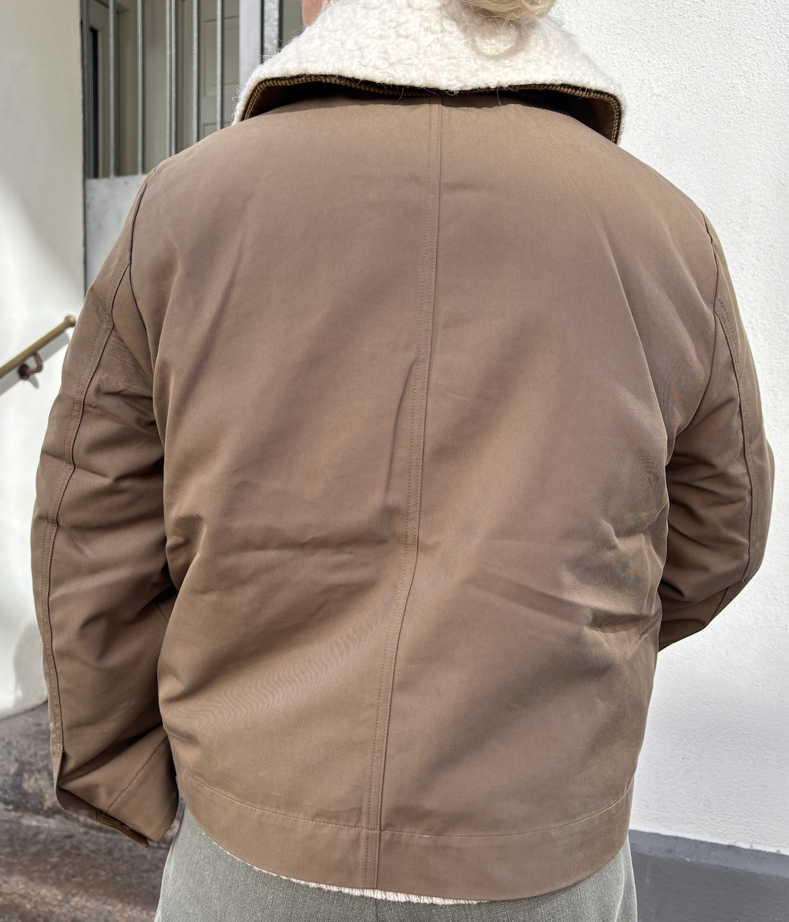 Jakke med teddykrave fra Lovechild 1979. Jakken har aftagelig quiltet foring og krave. Den har to-delt ærme med trykknapper for justerbar pasform og skjult knaplukning samt patchlommer med klapper og trykknapper.