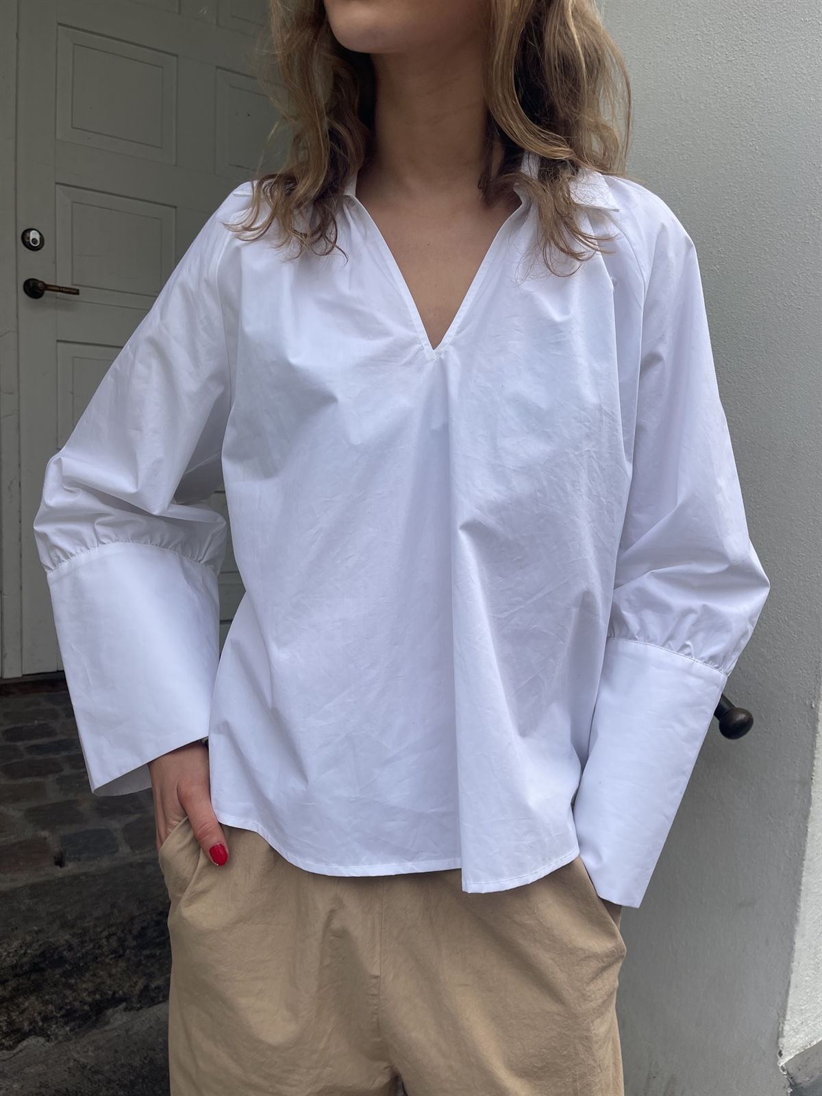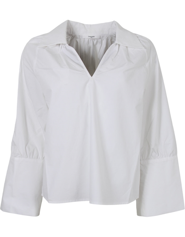 Smuk skjorte/bluse fra Lovechild SS 26. Skjorten har lange ærmer, brede manchetter ved ærmer og v-åbning ved hals.
