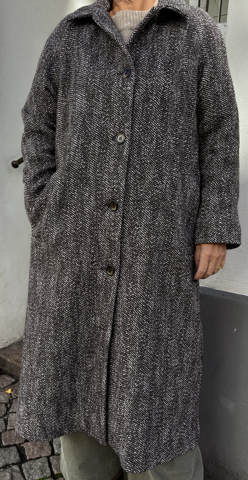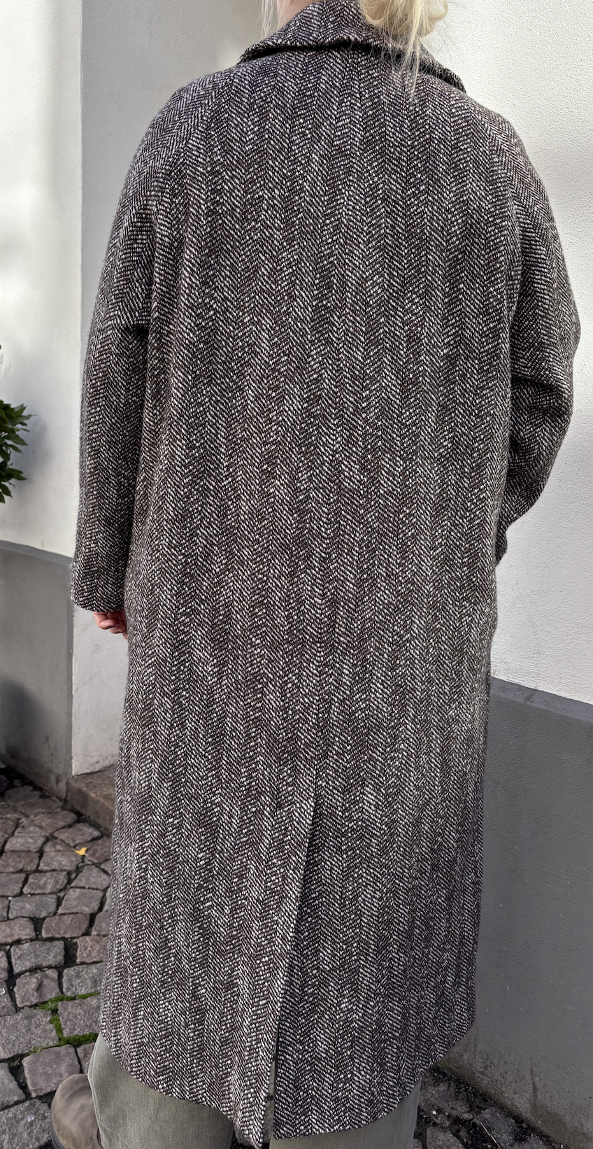Stilfuld og tidløs frakke fra Lovechild 1979. Frakken i brun herringbone har raglan ærmer og enkeltradet knaplukning. Den har skrålommer og slids bagpå.