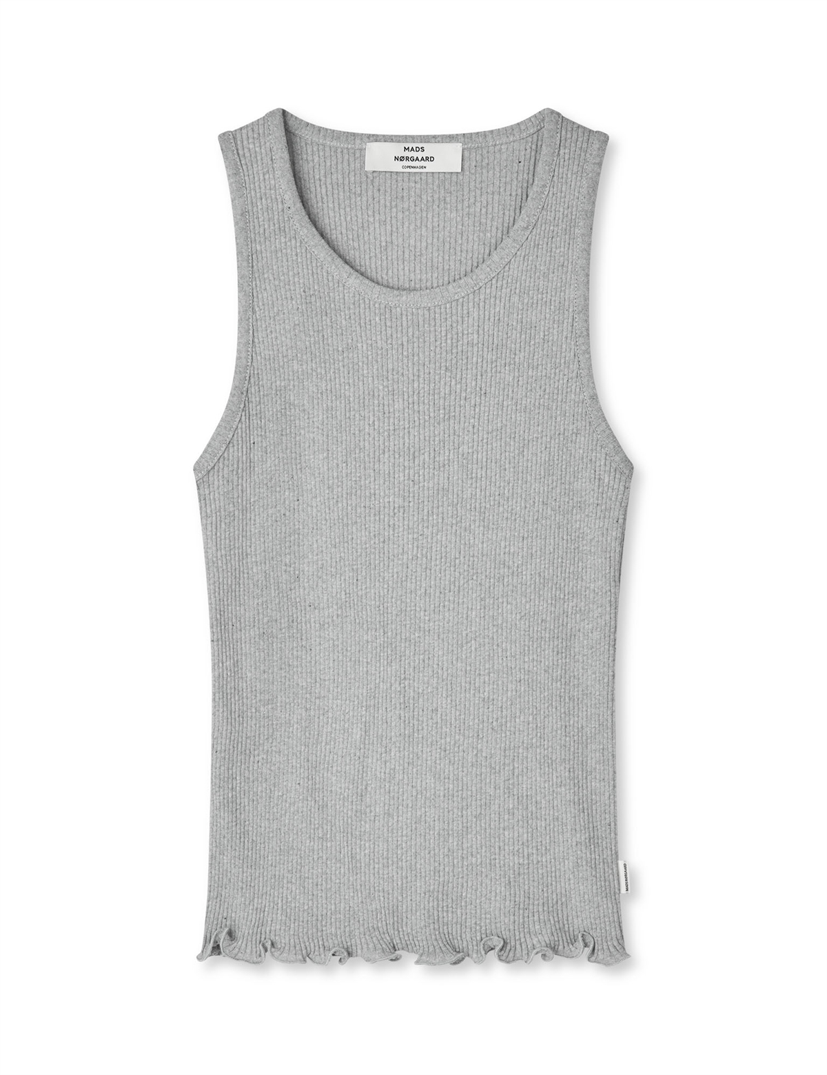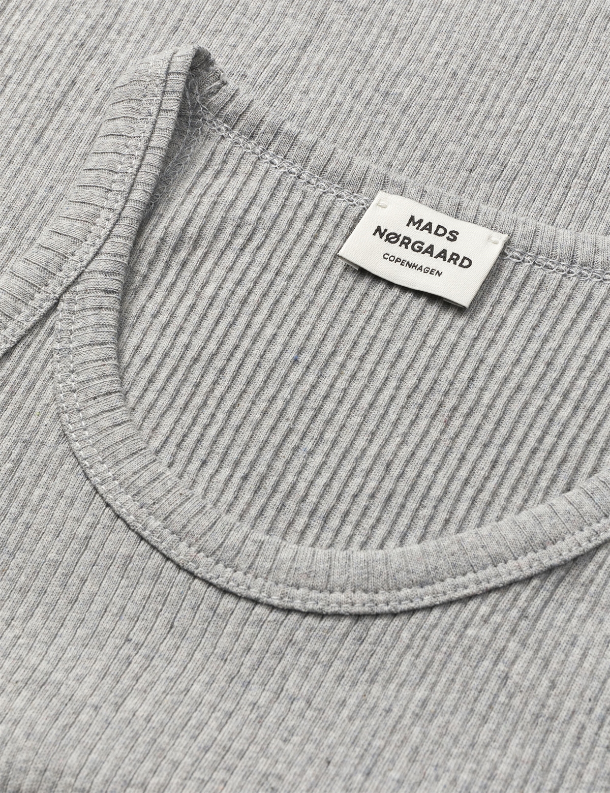 Smart Top med rund hals fra Mads Nørgaard SS 2026. Toppen har normal længde, skulderstropper og struktur i stoffet.