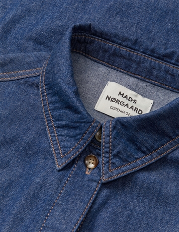 Flot kjole med lille krave fra Mads Nørgaard SS 2026. Kjolen er knælang, lukkes med knapper fortil og har lille krave. Ærmerne har manchet.