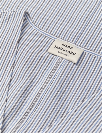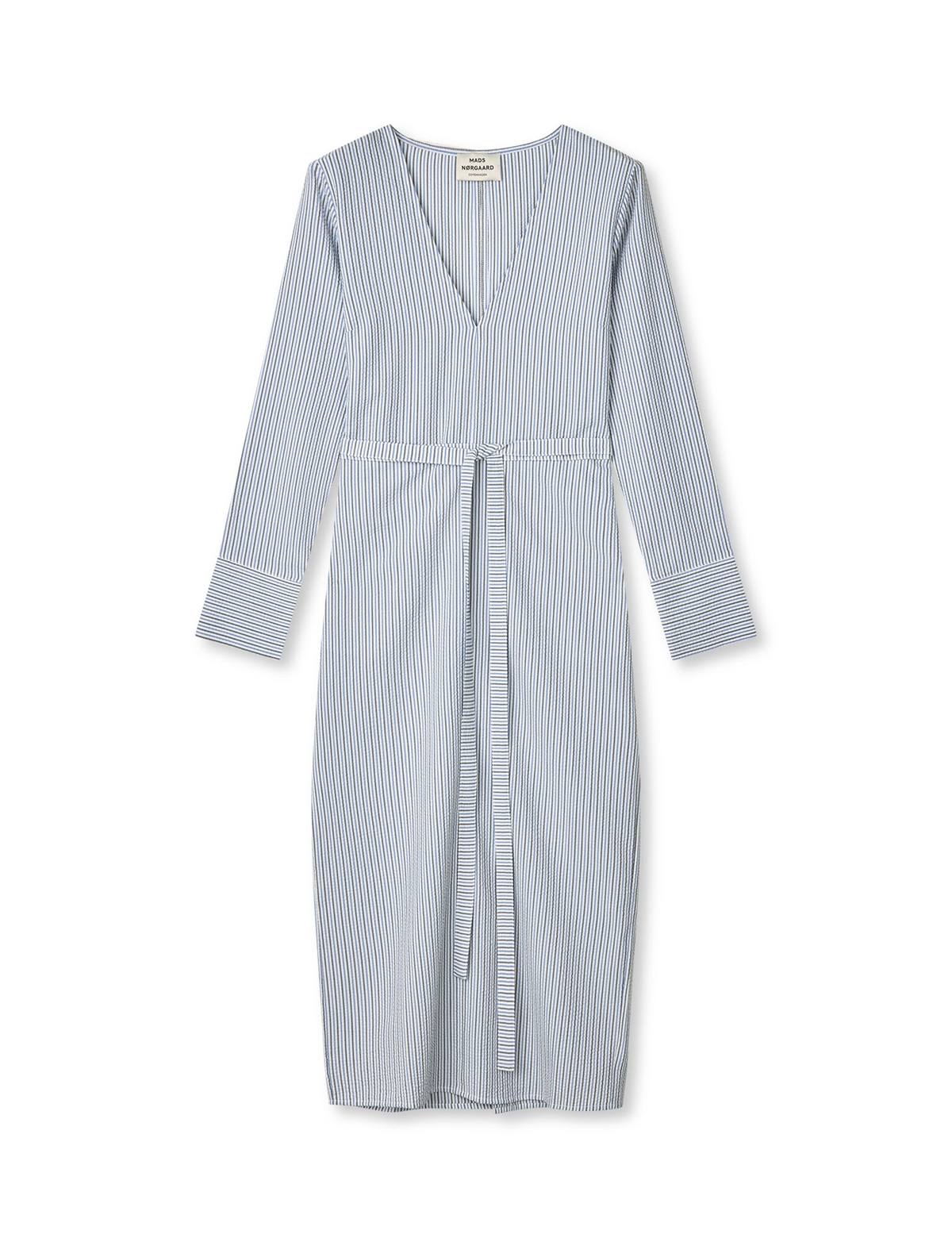 Smuk kjole fra Mads Nørgaard SS 2026. Kjolen har V-udskæring, lange ærmer, markerede manchetter. Kjolen bindes med bånd ved livet men kan også bæres uden bindebånd. Lige og enkel silhuet.