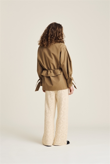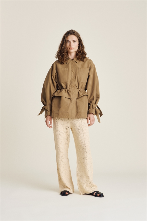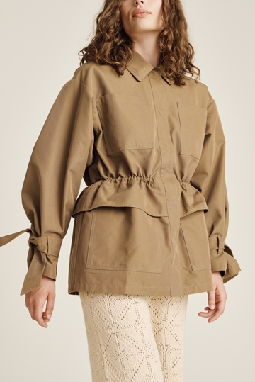 Cypress Parka fra Nué notes. Jakken er både praktisk og funktionel, den har voluminøse ærmer med bindebånd, elastik i taljen . To brystlommer samt to lommer under flæsen. Trykknapper under en stolpelook.