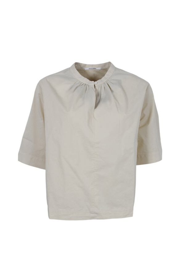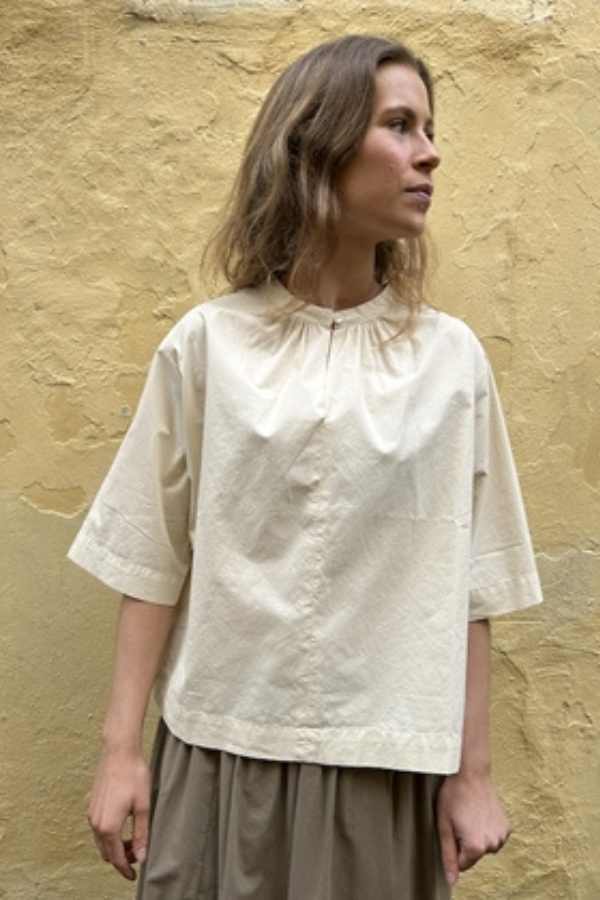 Skjortebluse i bomuld fra Pomandère. Blusen har trekvart lange ærmer, rund halsudskæring og nøglehulsåbning. Den fineste bomuld/silke kvalitet med let stribet tekstur. Afslappet/boxy pasform.