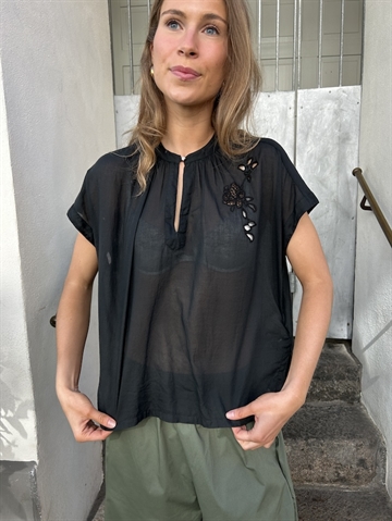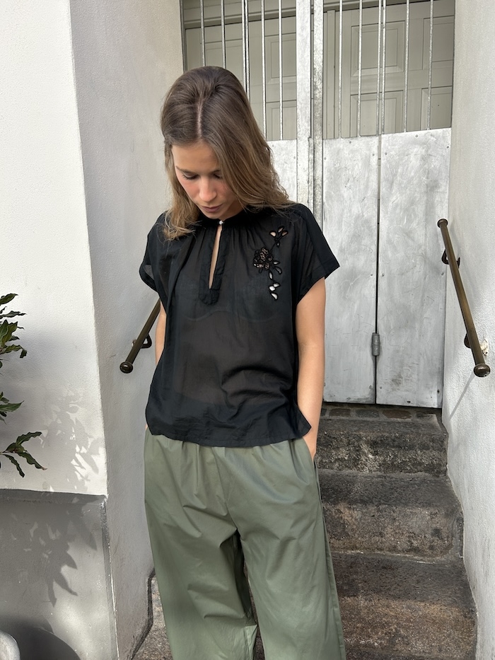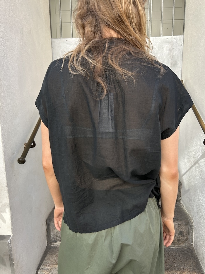 Elegant Ærmeløsskjorte fra Pomandère SS 2026 . Skjorten lukkes med lille knap foran og en har rund krave, der tilføjer et sofistikeret touch. Der er smukke broderi i stoffet. Perfekt til et stilfuldt og luksuriøst look.