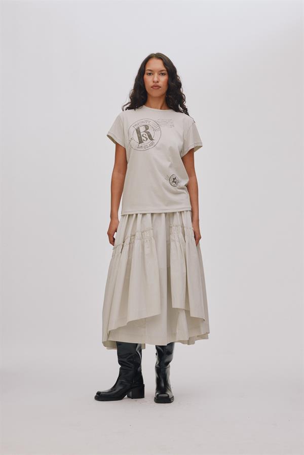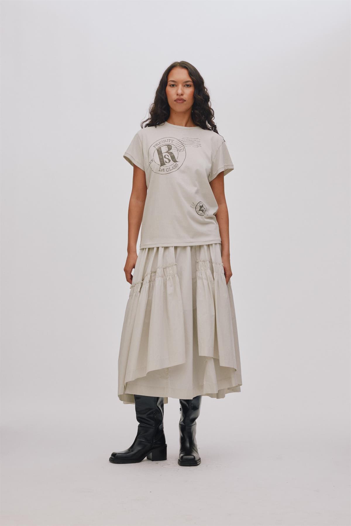 Elegant og luftig nederdel fra Rabens Saloner. Nederdelen er i poplin i lag på lag effekt, som giver den et voluminøst udtryk.