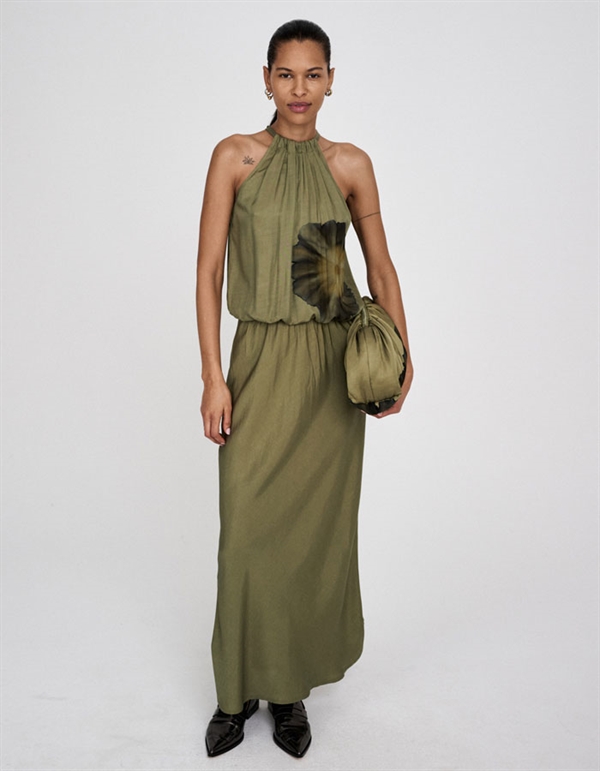 Elegant kjole fra fra Rabens Saloner AW 2025, med elegant pasform. Kjolen har halterneck der bindes med snøre i nakken og et smukt tie-dye blomsterprint. kjolen er lang med bånd ved livet der giver den en feminin silhuet.
