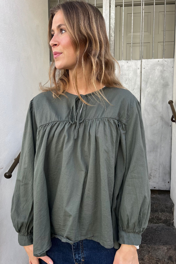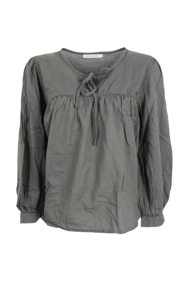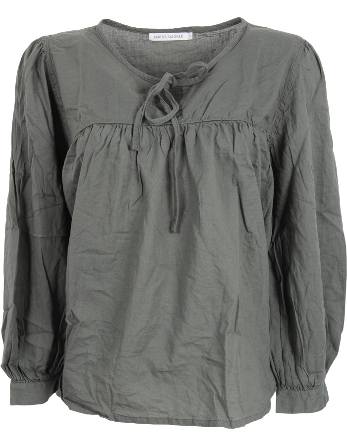 Rabens Saloner Eike bluse fra SS 26. Blusen har et løstsiddende design, stor v-udskæring der bindes med snøre. Blusen er i en let og luftig bomuld.