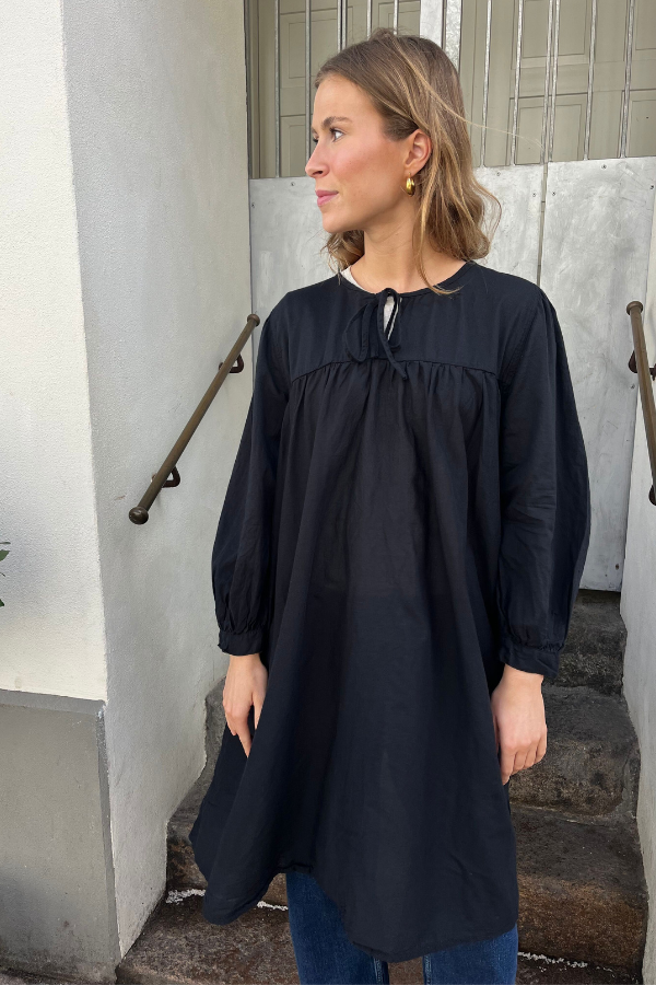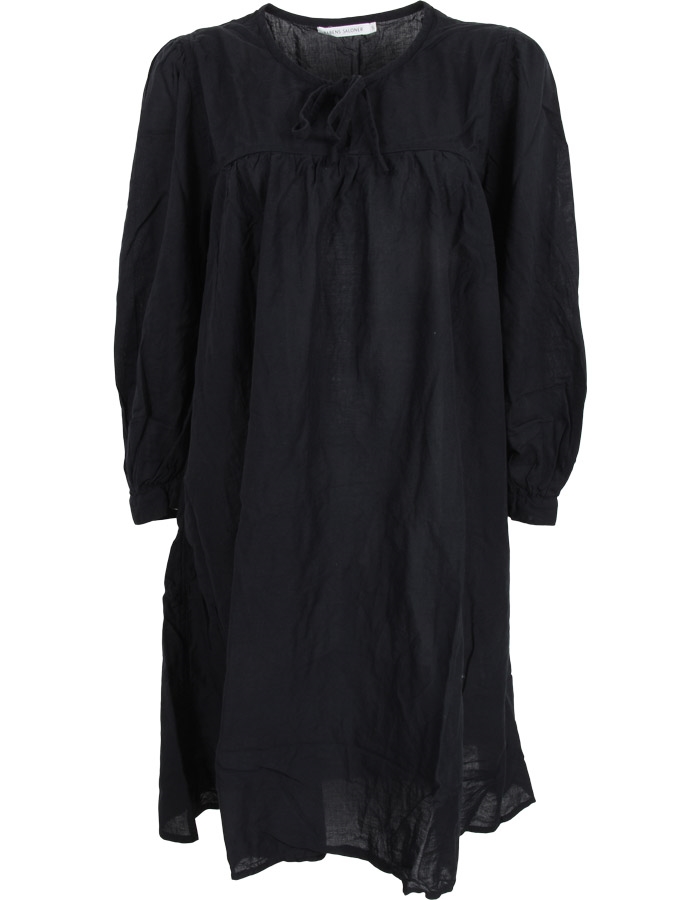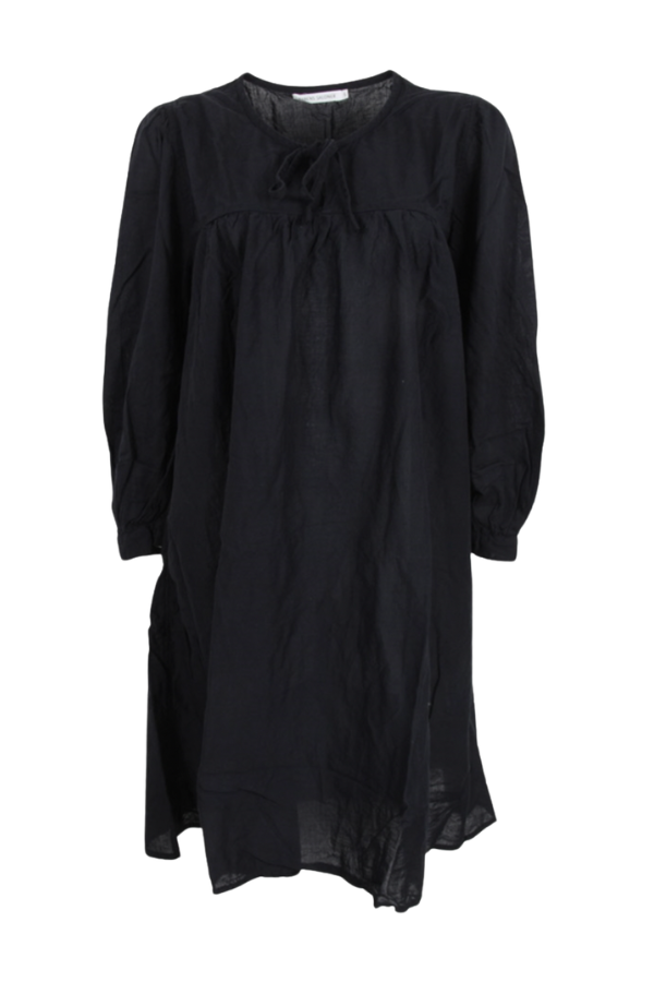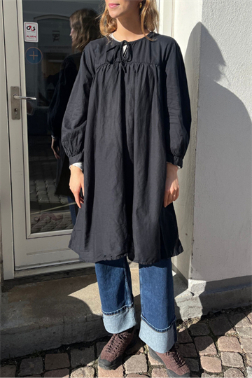 Rabens Saloner Elda kjole fra SS 26. Kjolen har et løst afslappet design og har længde til knæ. Kjolen har løse ærmer der lukkes med manchetter. Kjolen har V-krave der bindes med snøre.