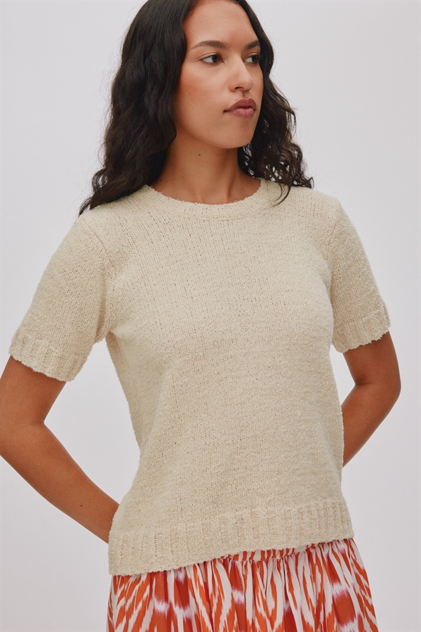 Smuk strik t-shirt fra Rabens Saloner . T-shirten har korte ærmer og rund hals, smart, casual til sommeren.