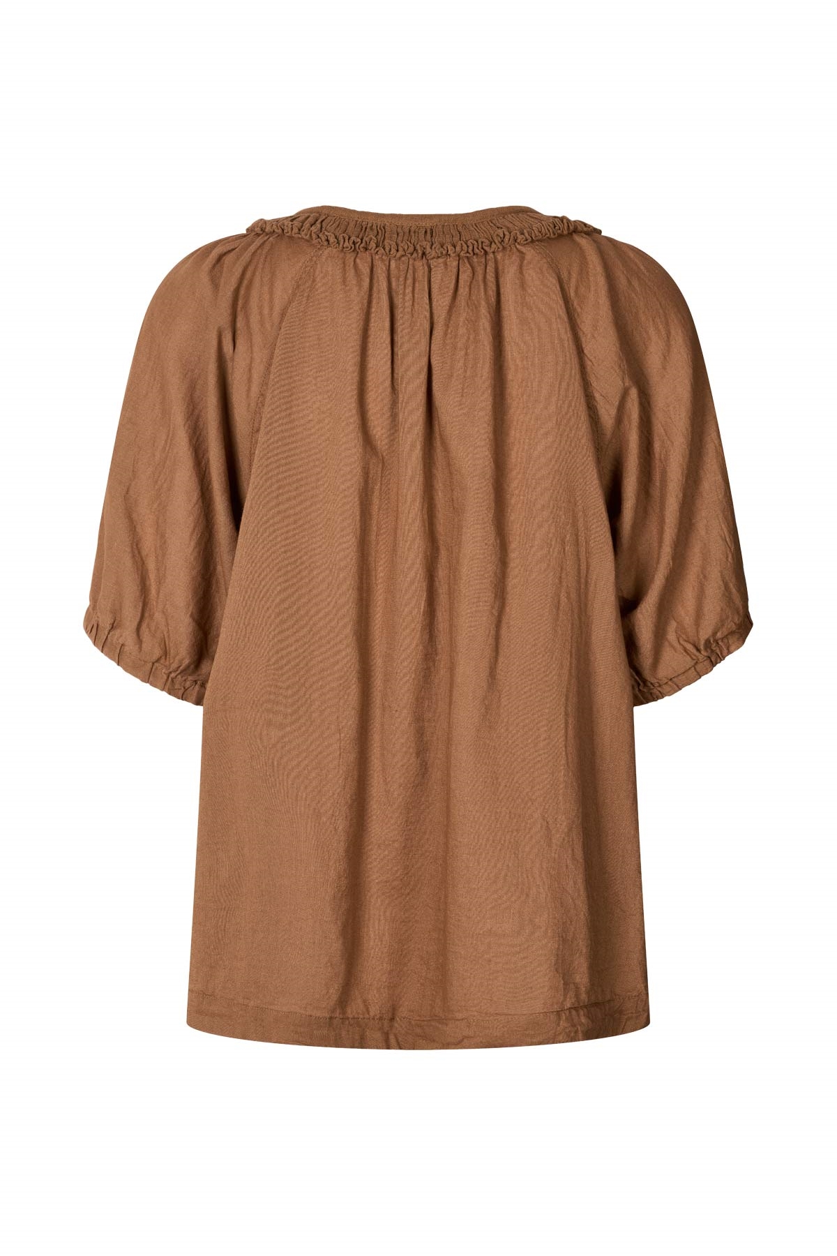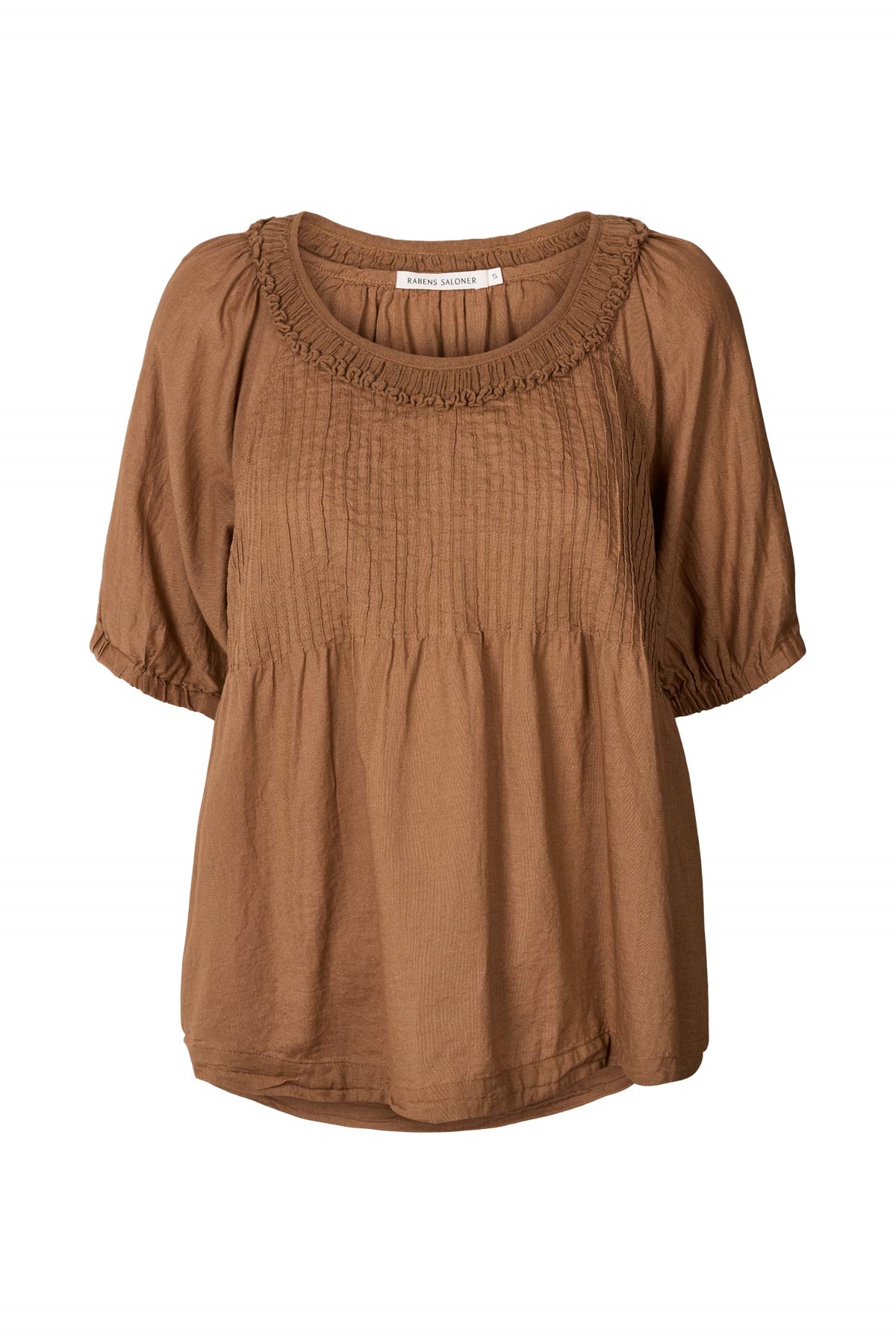 Denne top fra Rabens Saloner kombinerer komfort og elegance med sine korte ærmer og feminine detaljer. Den er lavet i blød bomuld, hvilket gør den perfekt til både hverdagsbrug og festlige lejligheder.