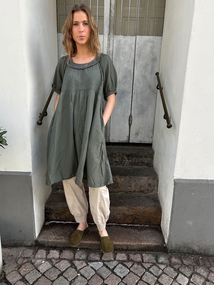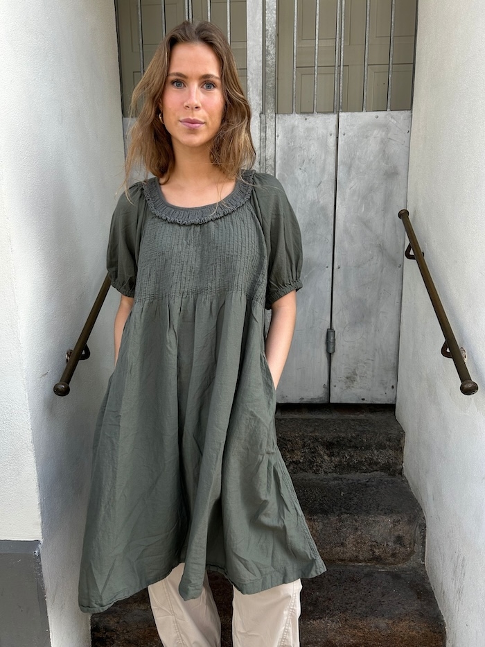 Denne smukke kjole fra Rabens Saloner kombinerer komfort og elegance med sine korte ærmer og feminine detaljer. Kjolen har et let og luftigt udtryk og den er lavet i blød bomuld, hvilket gør den perfekt til både hverdagsbrug og festlige lejligheder.