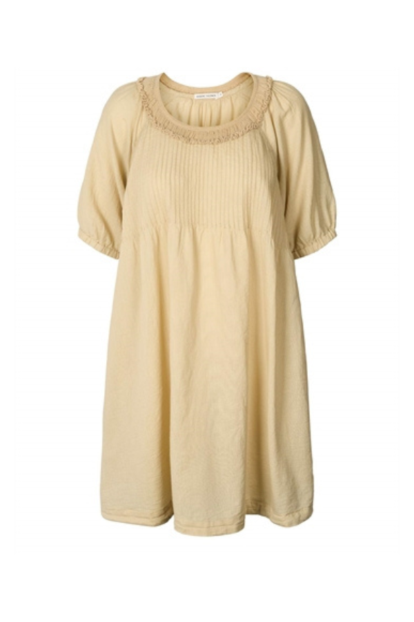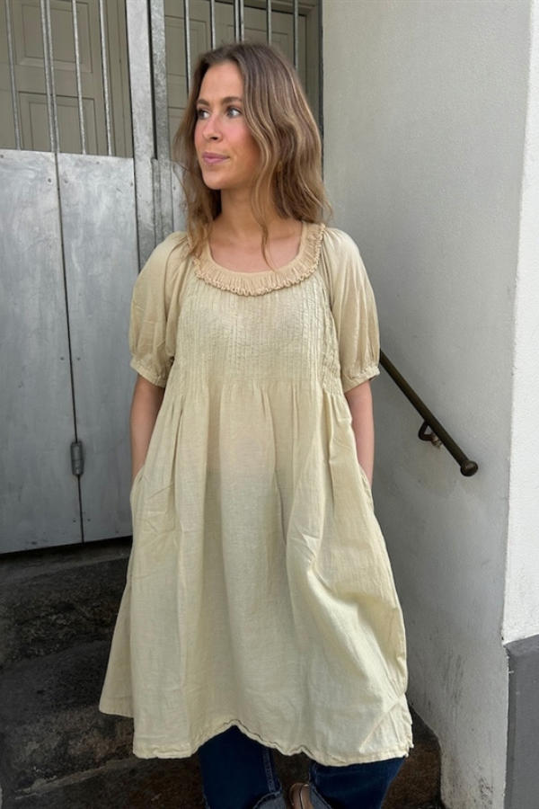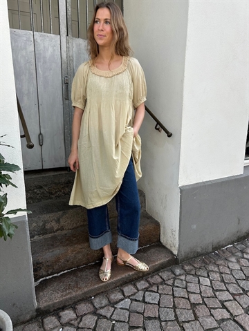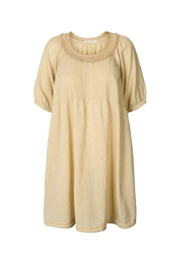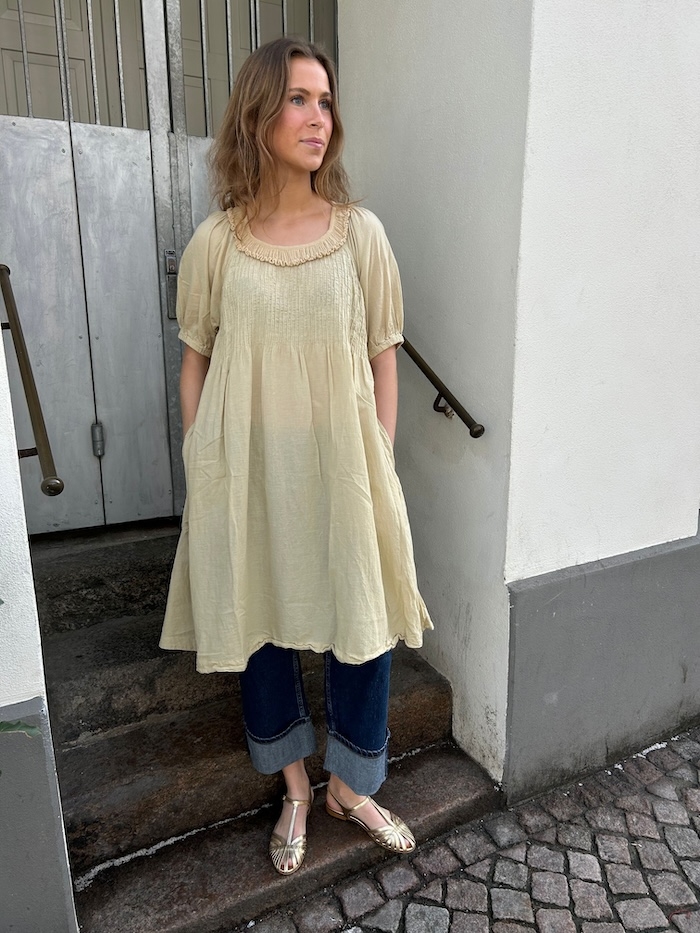 Denne smukke lange kjole fra Rabens Saloner kombinerer komfort og elegance med sine korte ærmer og feminine detaljer. Kjolen har et let og luftigt udtryk og den er lavet i blød bomuld, hvilket gør den perfekt til både hverdagsbrug og festlige lejligheder.