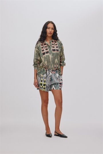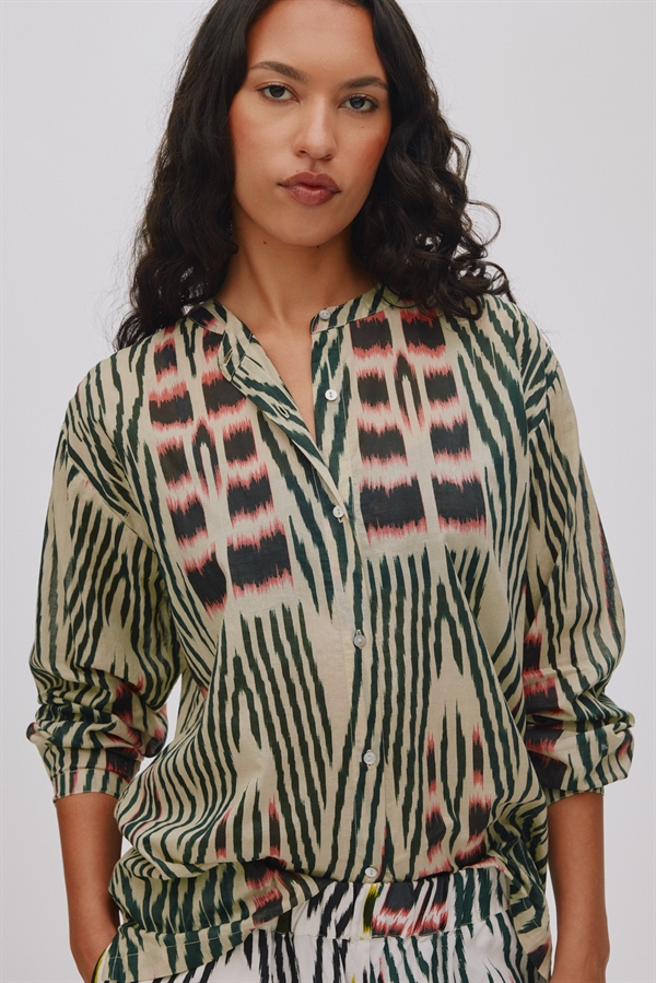 Rabens Saloner Sibyl bluse fra SS 26. Blusen har et løst afslappet design og er let stumpende. Blusen har et smukt Ikat mønster der er håndfarvet på Bali. Blusen er let og luftig og har v-udskæring med knaplukning.