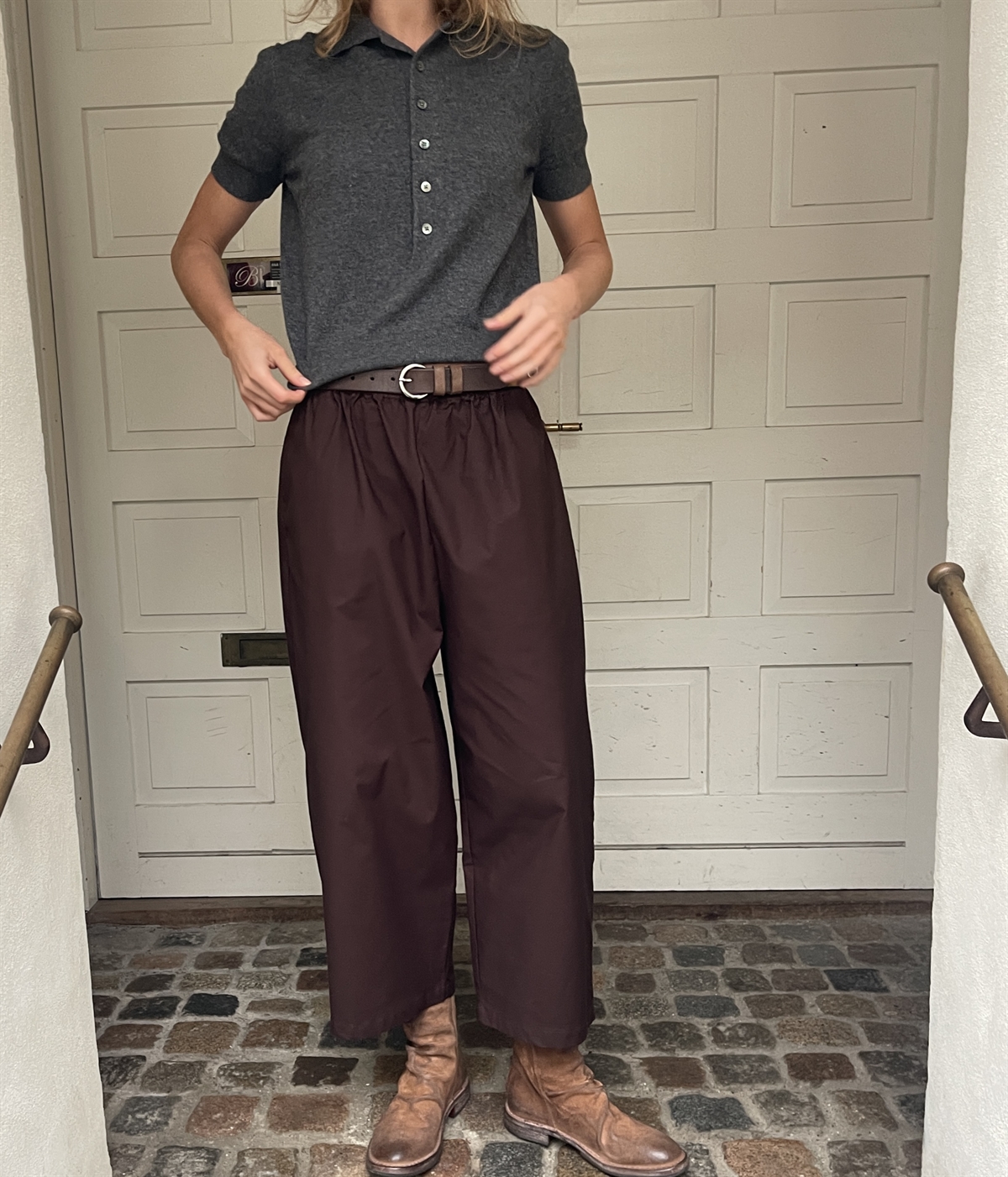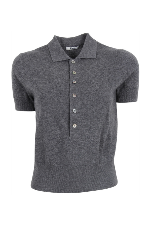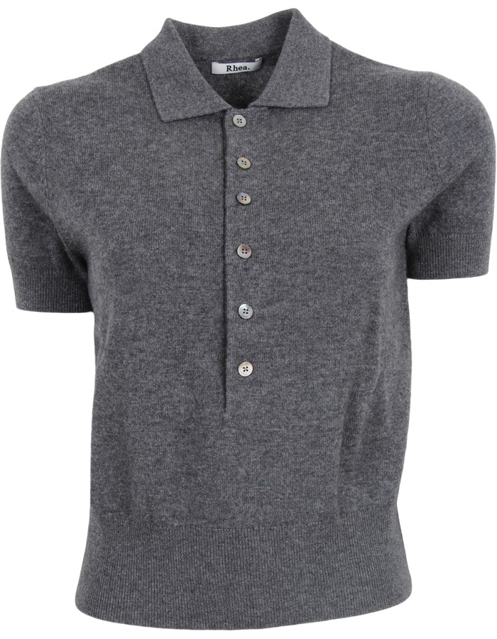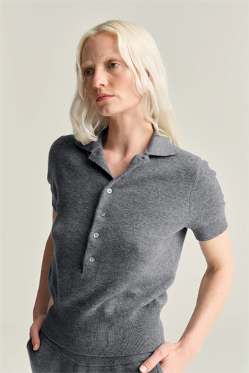 Smuk Polo fra Rhea AW 2025. Blusen er i en lækker Merino uld blanding, har korte ærmer, rund hals og lukkes med knapper fortil.