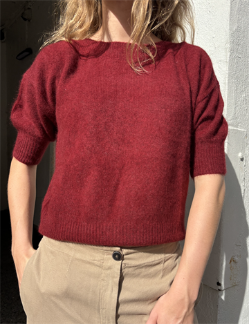 Moi sweater fra Six Ames. Materialet er det velkendte, ultra bløde, lette og behagelige raccoon strik. Sweateren har korte ærmer og elegant bådudskæring. Afslappet pasform.