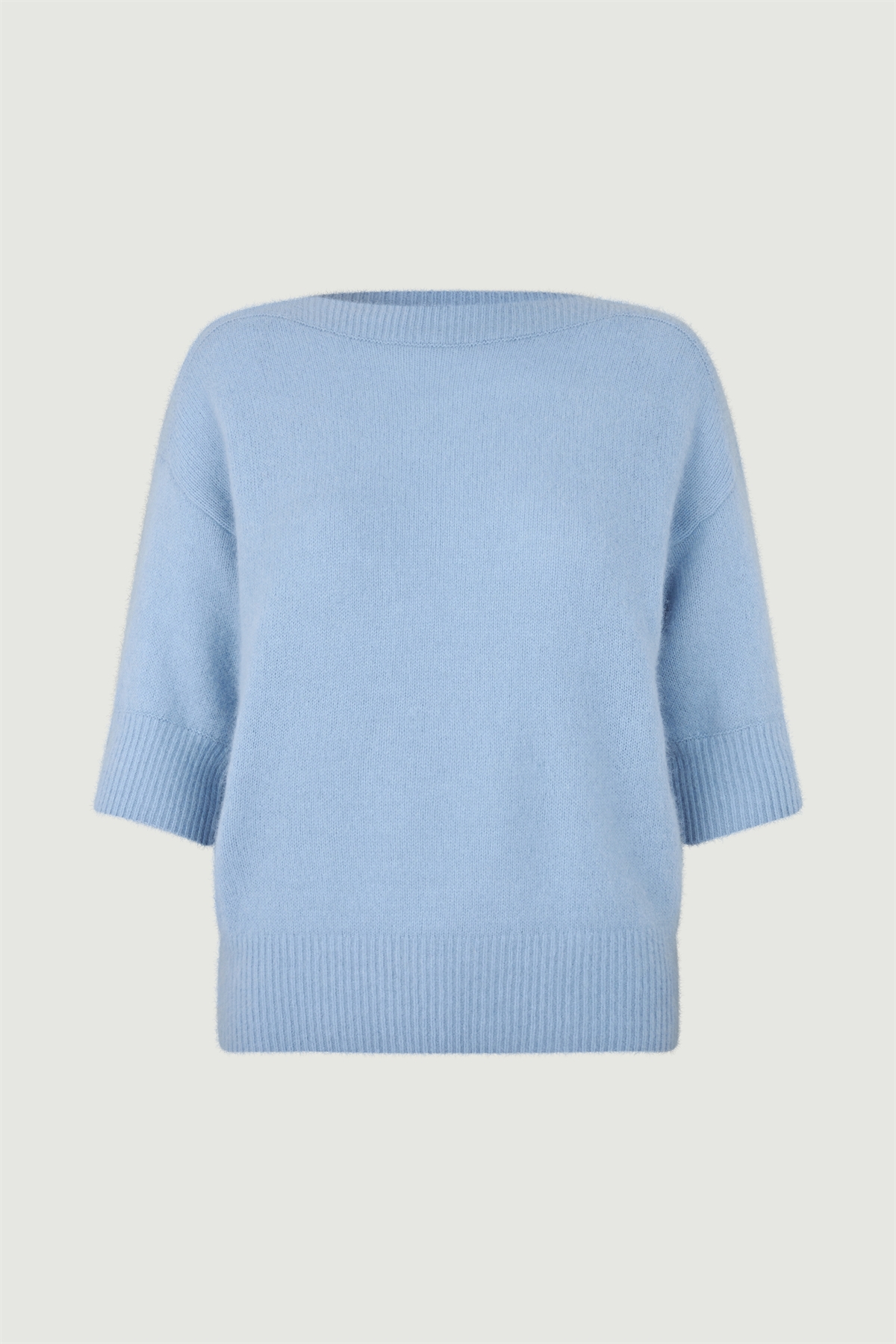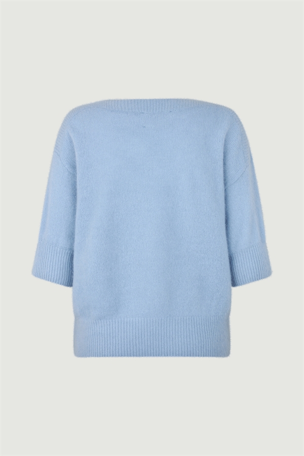 Moi sweater fra Six Ames. Materialet er det velkendte, ultra bløde, lette og behagelige raccoon strik. Sweateren har korte ærmer og elegant bådudskæring. Afslappet pasform.