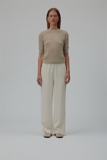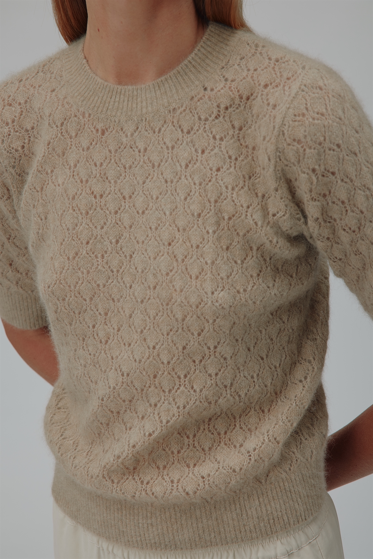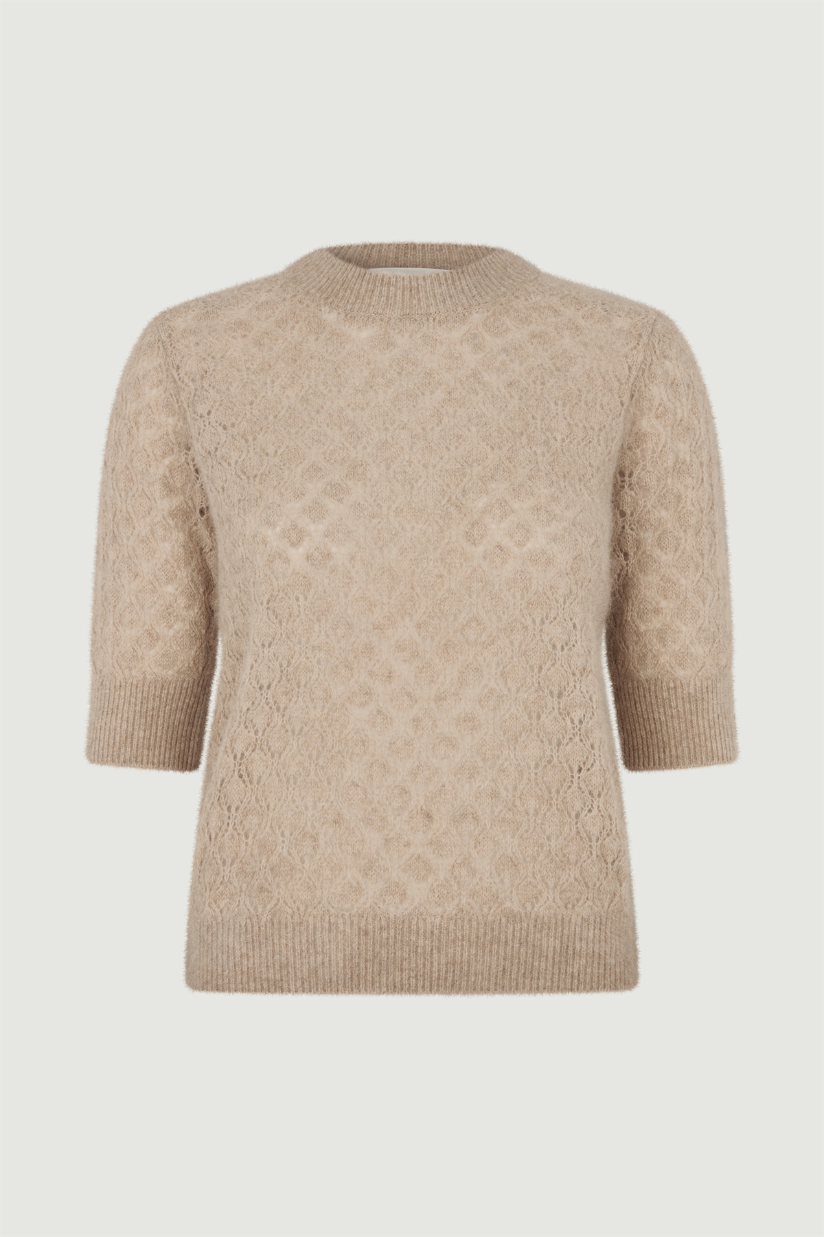 Rocca Sweater fra Six Ames. Materialet er den velkendte og ultra bløde raccoon strik. Sweateren har mellem korte ærmer, flot mønster i stoffet og rund hals med ribkanter. Afslappet pasform.