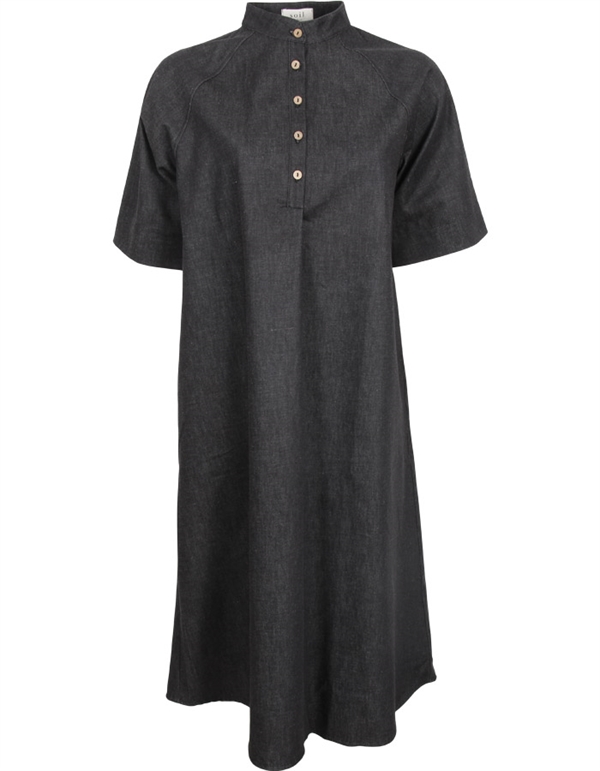 Smuk kjole fra Soil Aarhus med korte ærmer i grå denim. Kjolen har knapper foran, den er A-formet og fitter løst.