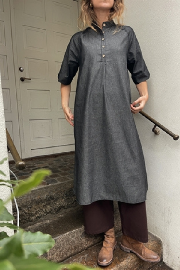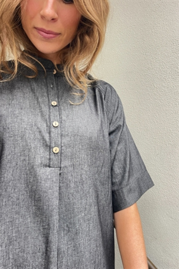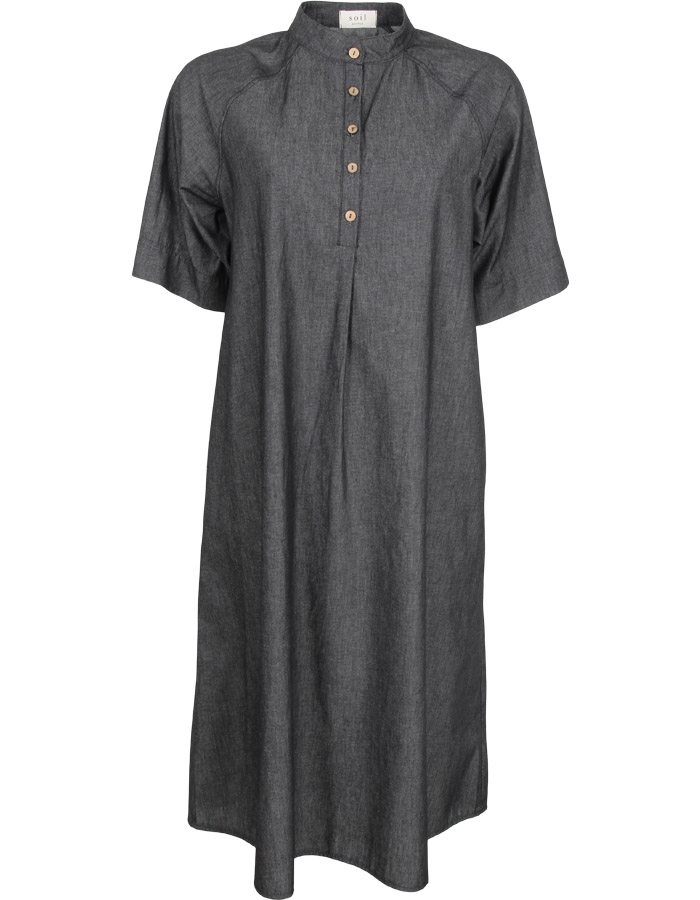 Smuk kjole fra Soil Aarhus med korte ærmer i grå denim. Kjolen har knapper foran, den er A-formet og fitter løst.