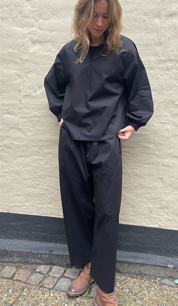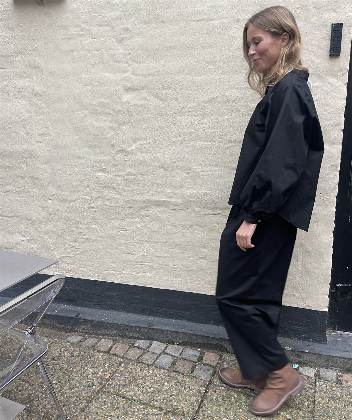 Smuk oversize buks fra Soil Aarhus i lækkert sort Poplin. Buksen har en afslappet pasform og har elastik i taljen.