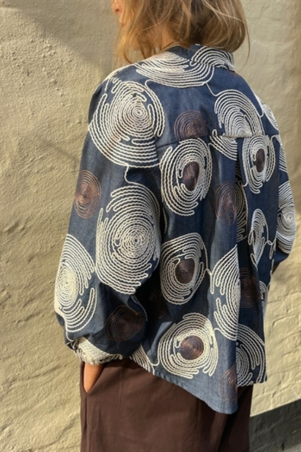 Smuk oversize bluse i grafiske circle print fra Soil Aarhus.Designet er oversize hvilket giver den et elegant og afslappet look. Blusen har en lille V-hals, elastik i ærmerne samt et smukt læg i ryggen. Blusen er perfekt til både hverdag og fest