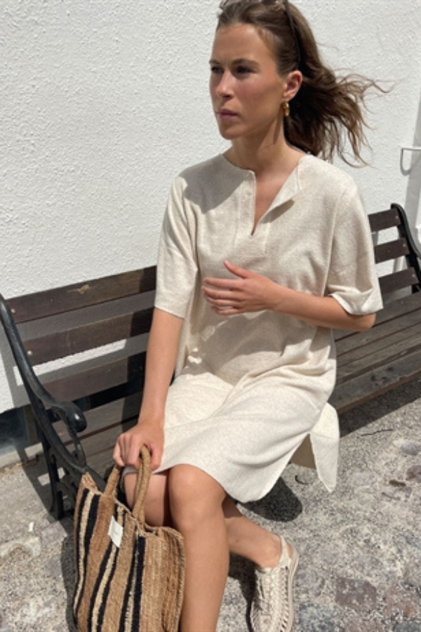 Frotte kjolen til din sommer fra Soil Aarhus. Kjolen har brede, korte ærmer og rund halsudskæring med v-formet åbning. Den er rundt skåret forneden med slids i siderne. Afslappet, behagelig pasform.