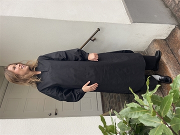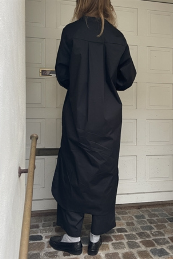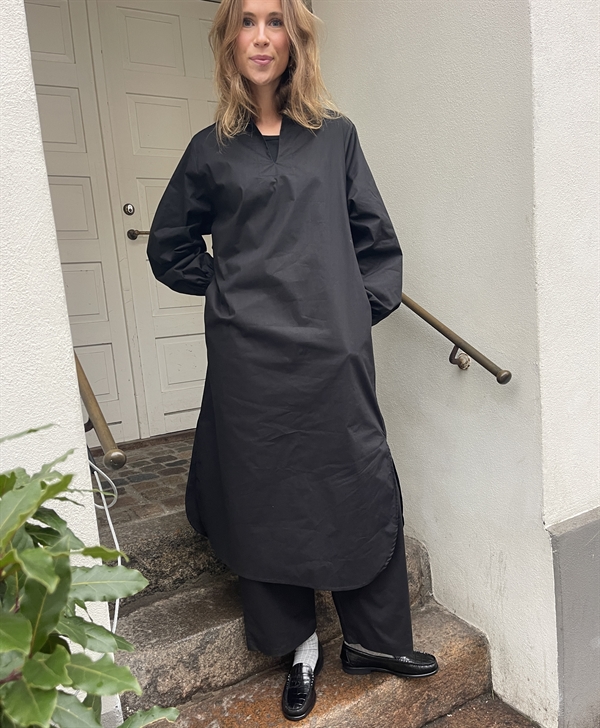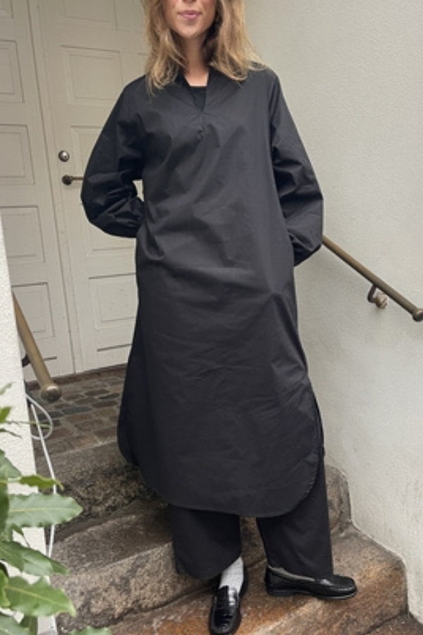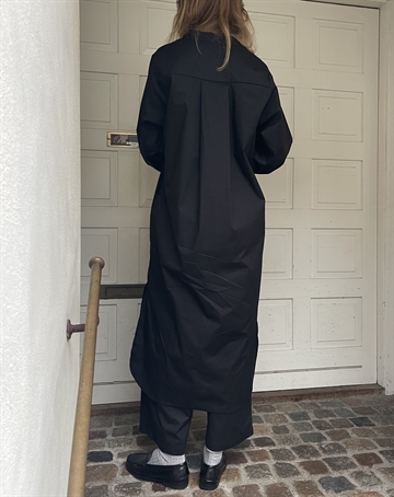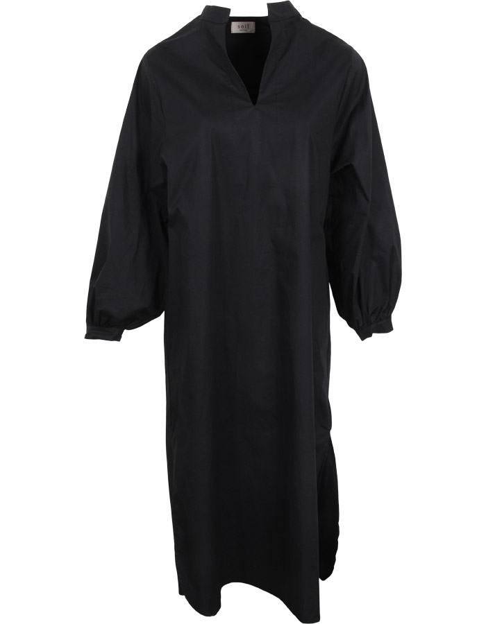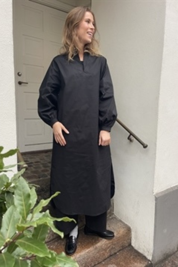 Smuk kjole fra Soil Aarhus med lange ærmer i sort poplin. Kjolen er åben foran og har en slids forneden i siden.