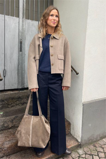 Vask: Hæng til udluftning for at rense det. Hvis vask er nødvendigt, håndvaskes det forsigtigt i koldt eller lunkent vand med et mildt uld- eller silkevaskemiddel. Undgå at vride, og lad tøjet tørre fladt på et håndklæde for at bevare formen