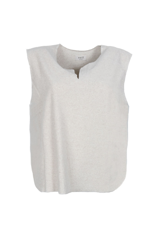 Frotte top til din sommer fra Soil Aarhus. Ærmeløs top med rund halsudskæring og v-formet åbning. Den er rundt skåret forneden. Afslappet, behagelig pasform.
