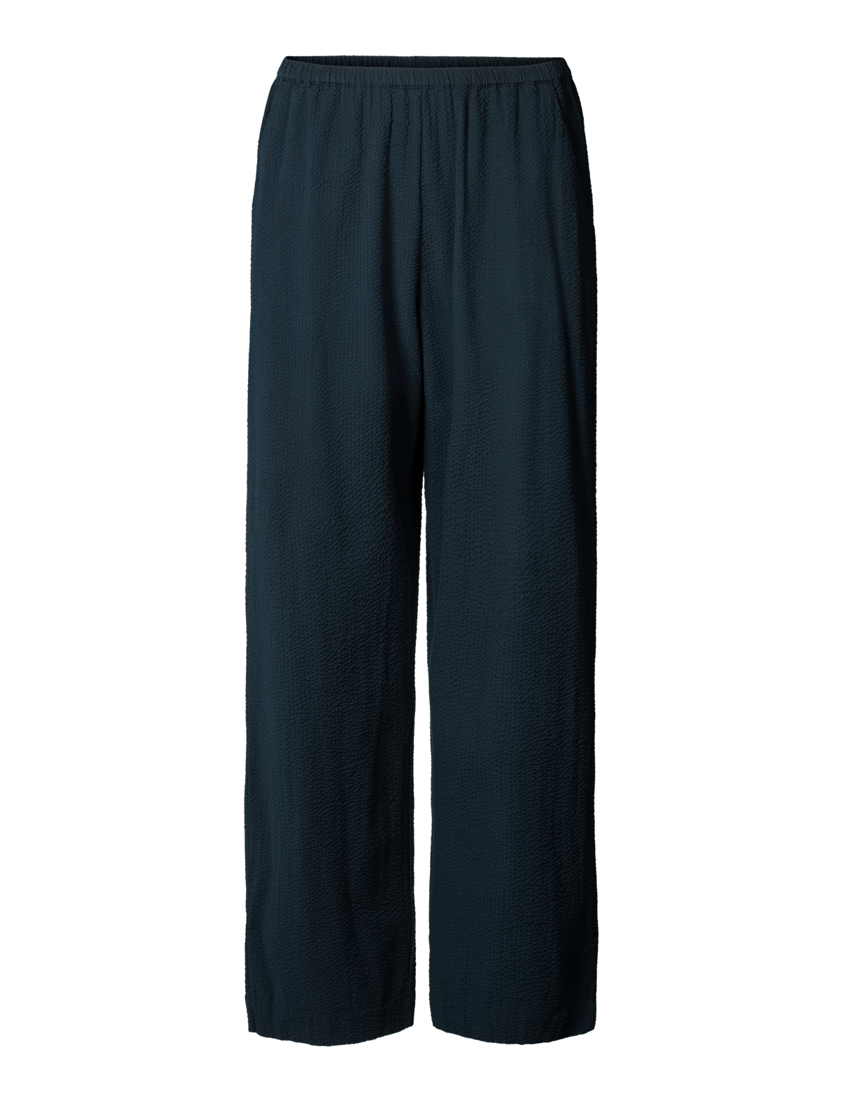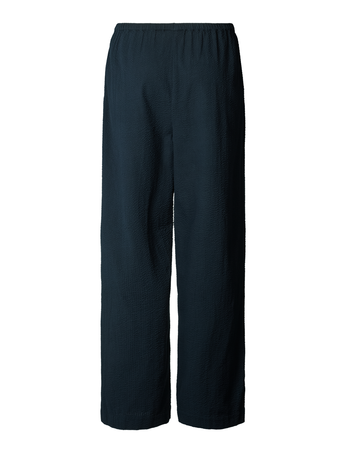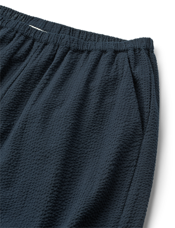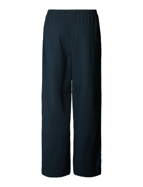 Skønne, vidde bukser i en let, økologisk bæk og bølge. Bukserne har brede ben, en løs silhuet, elastikbånd i taljen og to sidelommer fortil. Alle indvendige syninger er med franske sømme for en delikat og luksuriøs finish. Et formelt, men casual look.