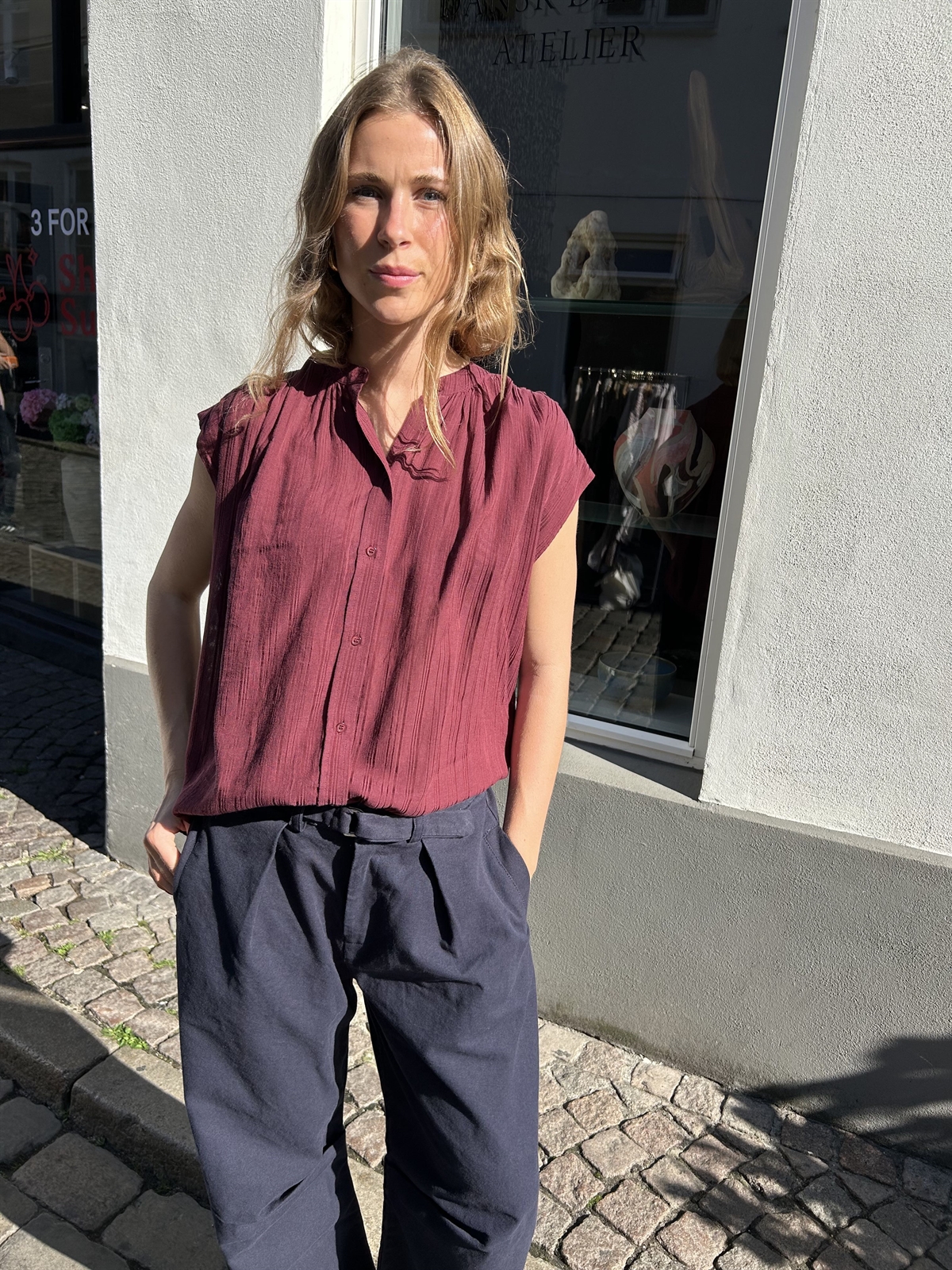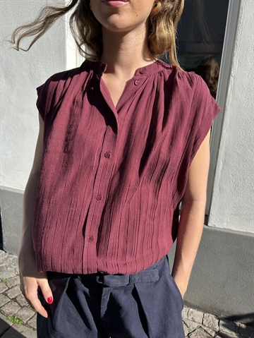 Denne Bordeaux bluse fra Vanessa Bruno er en elegant og alsidig klassiker. Blusen har en rund krave, knapper, korte ærmer og et let transparent udtryk og feminine rynkedetaljer ved hals, skuldre og ryg.