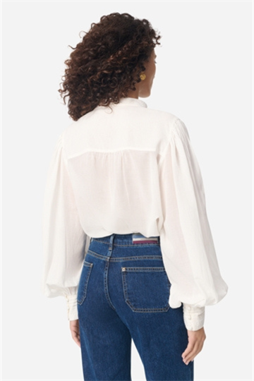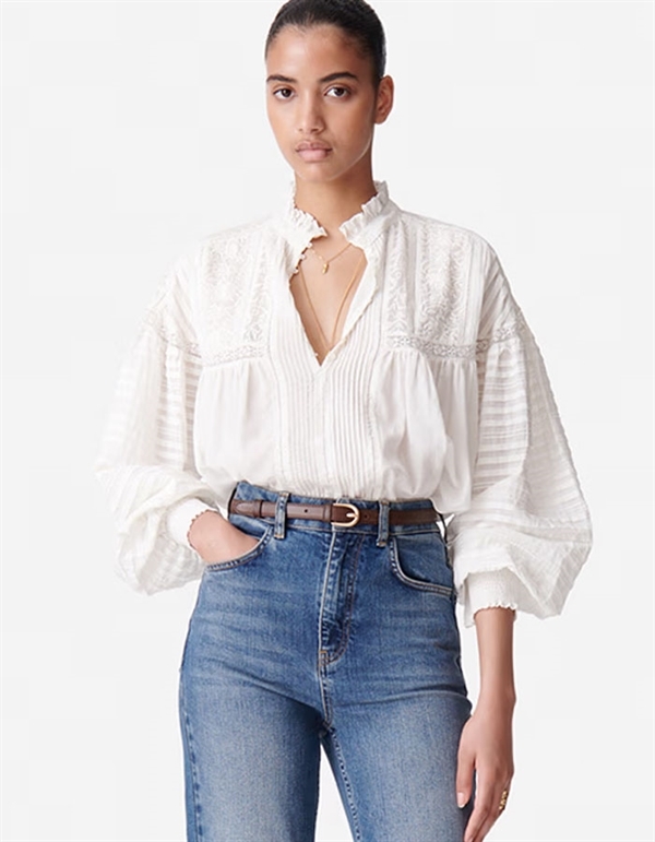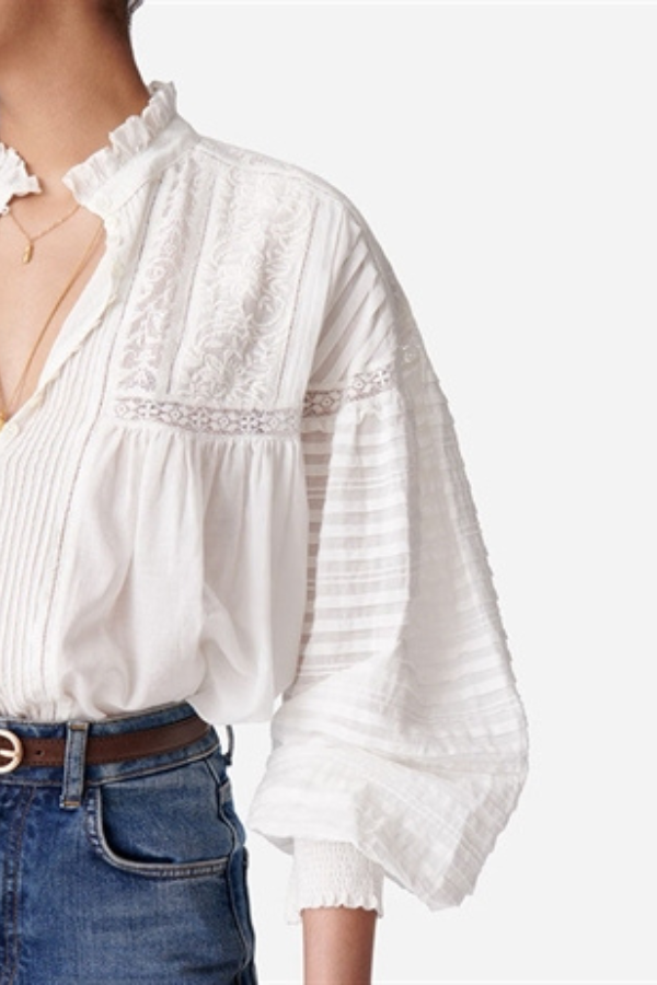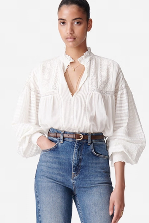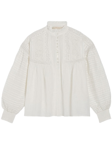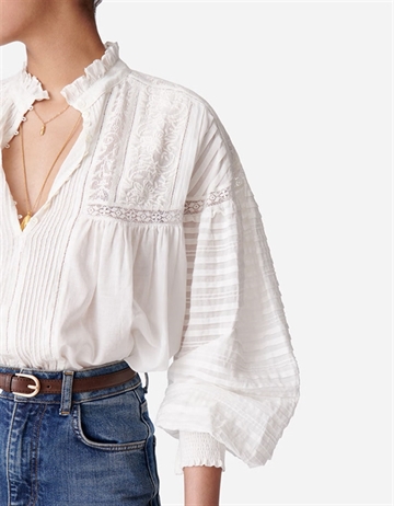 Vintage look skjortebluse fra Vanessa Bruno. Blusen har smukke plisseringer, blonder, broderinger og læg. Den har knaplukning foran, flæsekrave og lange, voluminøse ærmer med elastik smock om håndleddet som giver mulighed for at lege med silhuetten og volumen.