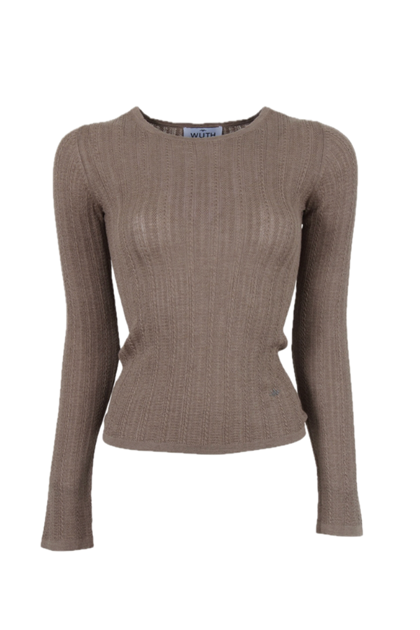 Smuk Bluse fra Wuth Copenhagen spring 2025. Blusen har rund hals udskæring. Blusen har lange ærmer og har flot mønster i den fine strik.