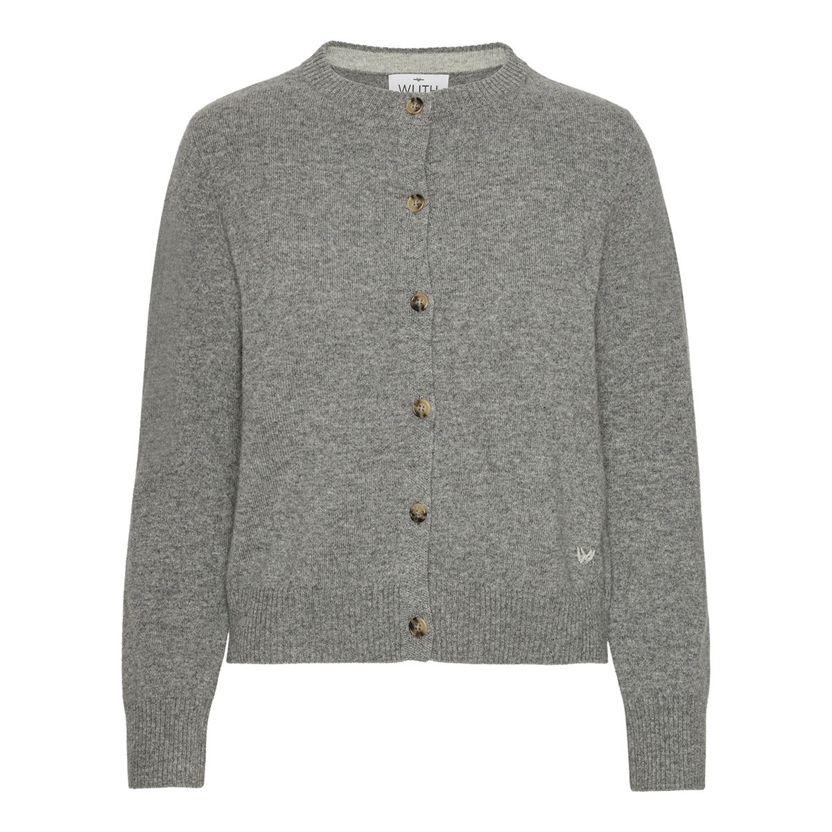 Klassisk Cardigan fra Wuth Copenhagen AW 2025. Cardiganen har ribkanter, manchetter ved ærmer og rund hals. Cardiganen lukkes med knapper fortil